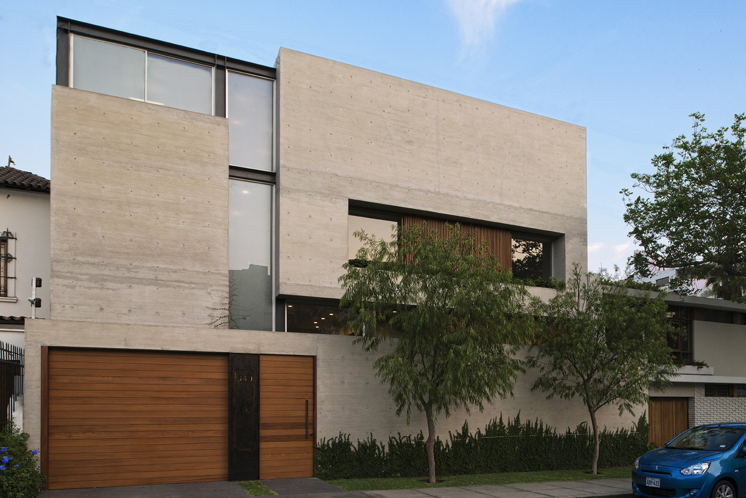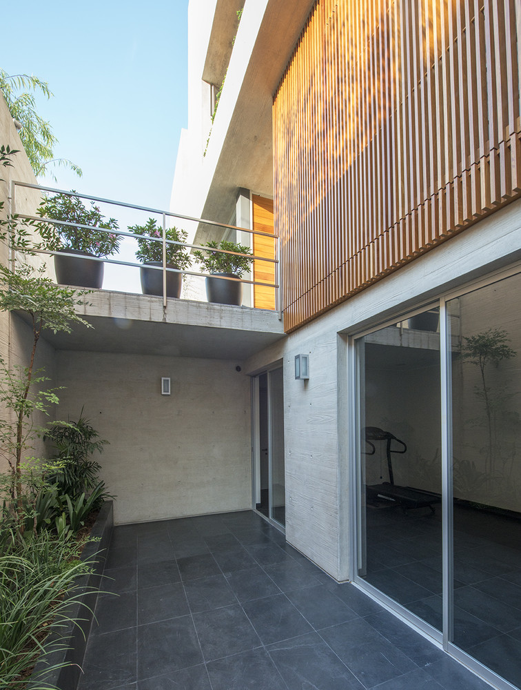 Like most of our projects, the house was completely built in concrete and steel to express its structural characteristics and plasticity, allowing it to be molded to create spaces and capture light, defining the interior and exterior spaces while using a series of vertical and horizontal wood screens to control the access of light and the privacy of the spaces.