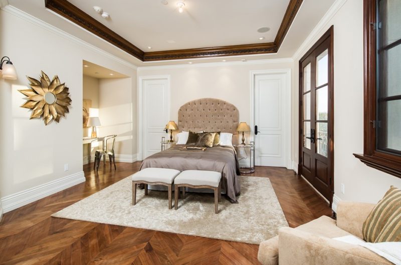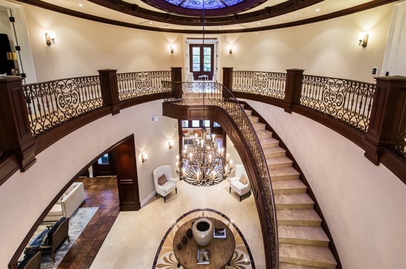 Speaking of accommodations, these include 5 bedrooms and 9 bathrooms, all lavishly appointed and gorgeously decorated. Living inside this palatial residence is a true treat for the senses, as its floor-to-ceiling windows and skylight allow it to be flooded with natural light for a touch of warmth and coziness. The living room is perhaps one of the most impressive areas of the house thanks to its tall ceilings, walnut floors and gorgeous Jerusalem Gold fireplace.
