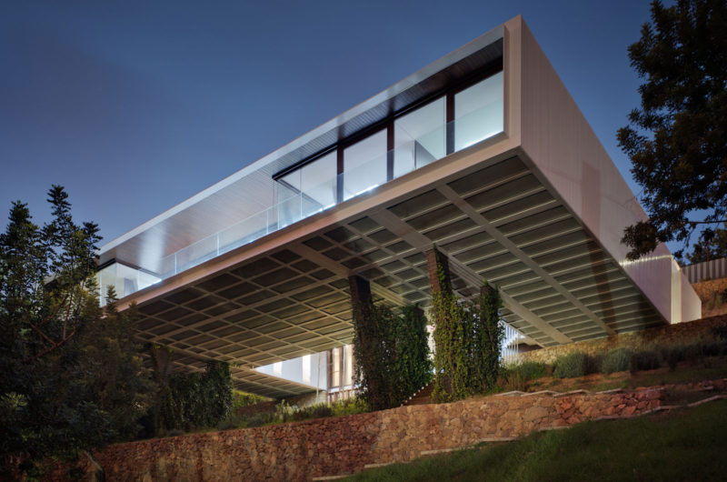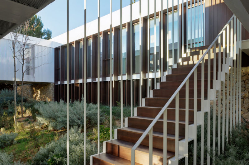 The project was completed by studio OAB and ADI Architectura. The two drew their inspiration from the 17th century history, when people were forced to build homes on all sorts of terrains, due to overpopulation. As a result, the gorgeous BF House stands tall on a slope, with part of the building being buried (garage and auxiliary spaces), while the other part stands on V-shaped metal pillars.