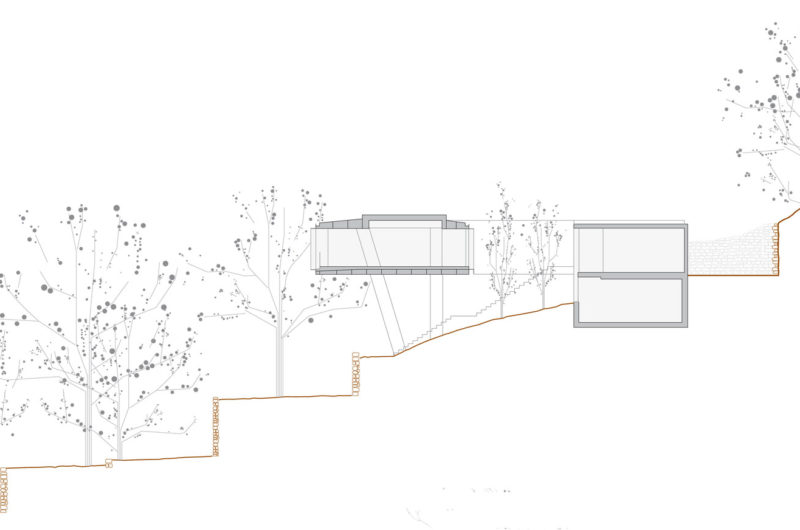 For the construction, the architects chose to use prefabricated elements that were simply put together on site. This also includes the metal structure of the house, which was created in a workshop and then transported in large pieces to be assembled at the construction site. No trees were sacrificed for this project, and even the vegetation that was affected for the buried part of the house was later replaced with indigenous plants.