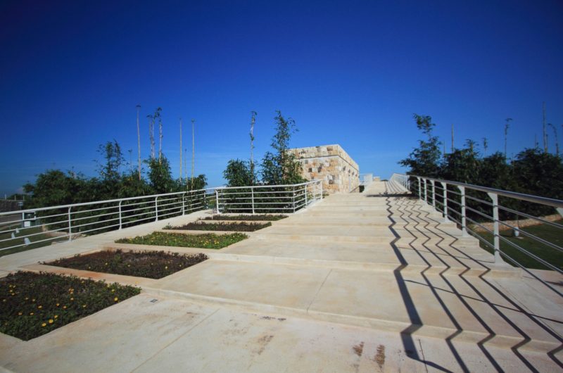The ascending plaza is crossed by a beautiful arched pool. Bet you’ve never seen a swimming pool protected by a curved flower bed that provides privacy and the wow effect.