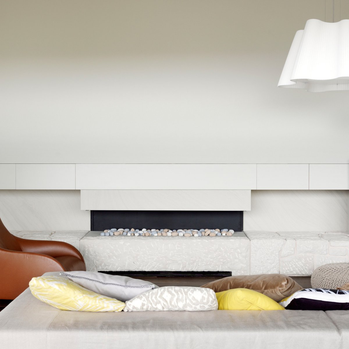 The windows in the living room slide away, to offer the necessary opening in order to access the timber deck, which is surrounded by a shallow water filled moat that is partially a spa.