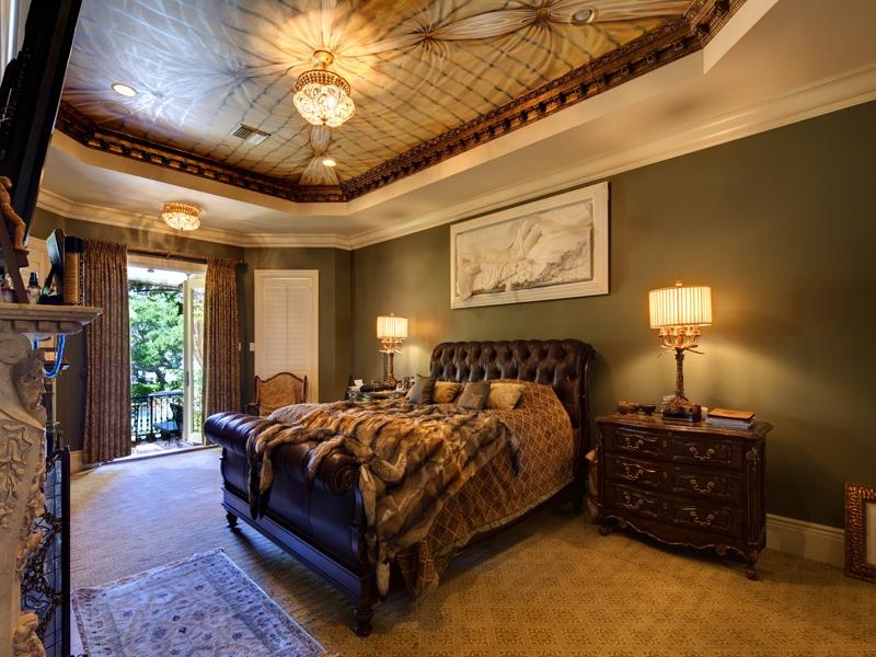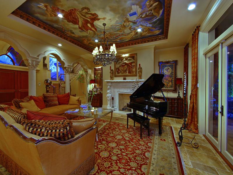 It features four bedrooms and an amazing master suite, five full/four half bathrooms, spacious living/dining quarters, a lush kitchen, a home theater/media room and a two story office emphasized by elegant stone, stained glass, wood and painted murals.