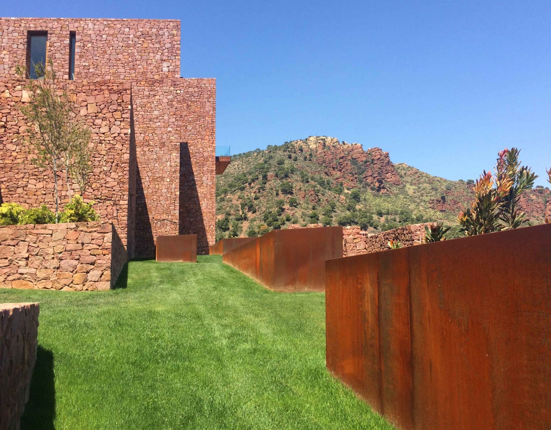 A mountain landscape, with big stone retaining walls, is the origin of the design of the layout of this house. Located in a housing state in Sagunto, Valencia, at the base of the Calderona Range, the Paz & Comedias House is fully integrated with its envi- ronment by reusing the red sandstone, extracted while opening the foundations, in the masonry walls.