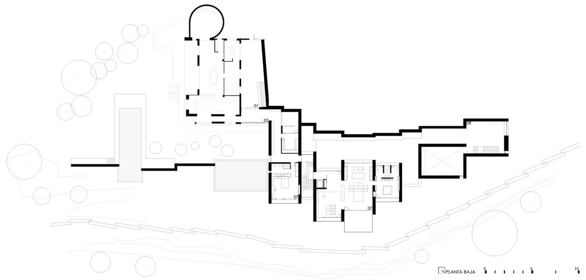 On the contrary, the western side of the house is limited by an intimate space, obtained by separating the house from the mountain. The stone walls work here as buttresses and create a courtyard that acts as a filter between the house and the landscape. This exterior space links the previous dwelling to its extension and becomes the lobby for the homeowner’s art gallery. Due to this, the most private parts of the house and its circulation are laid out in this zone.