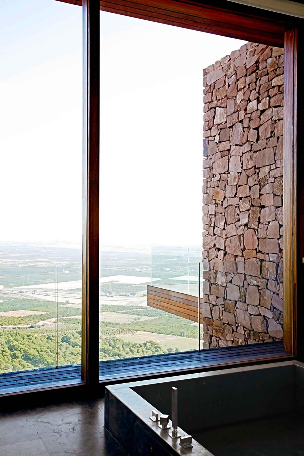 Wide glass panes encloses the stone walls, allowing total transparency between the mountain and the valley and emphasising the massiveness of the walls.