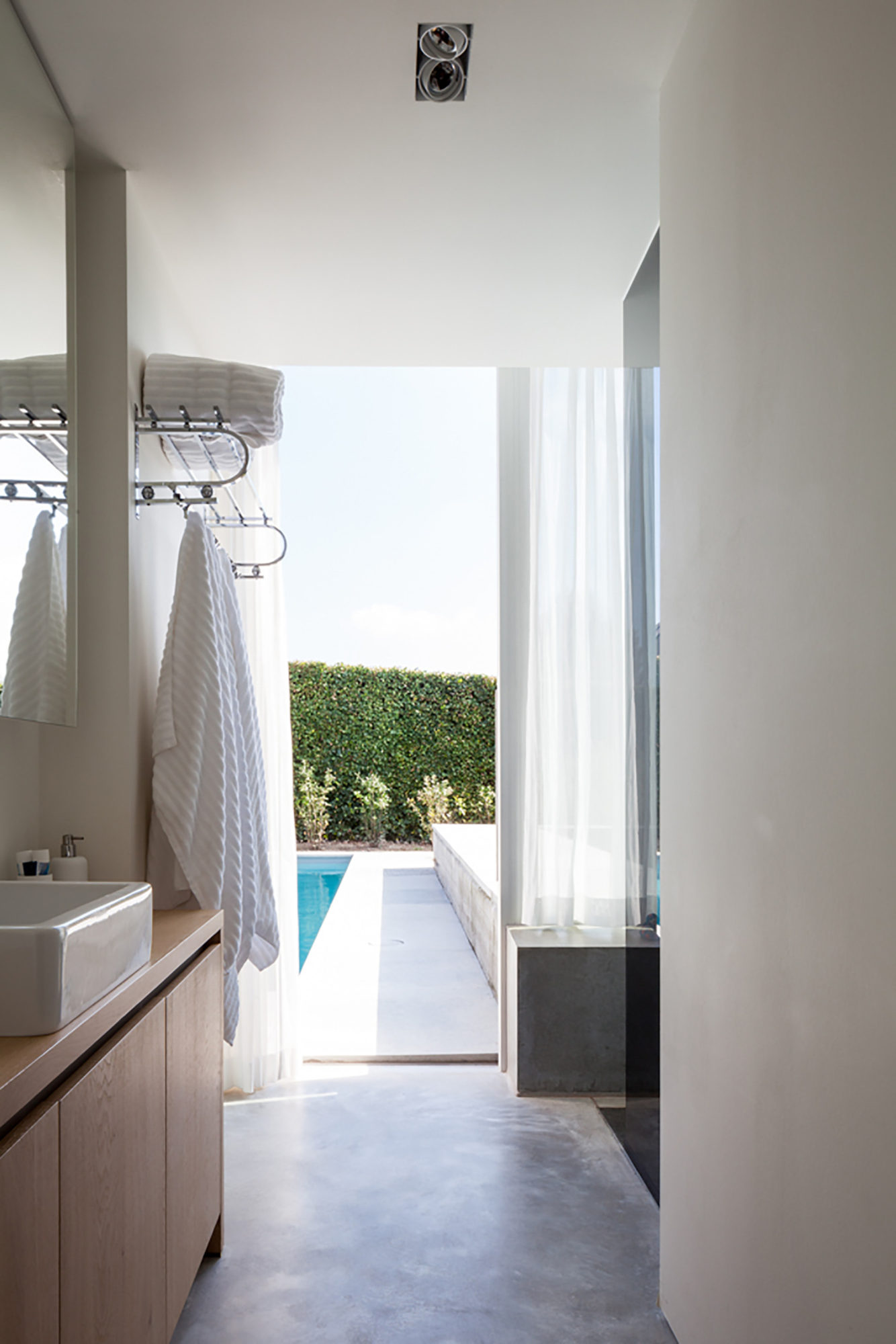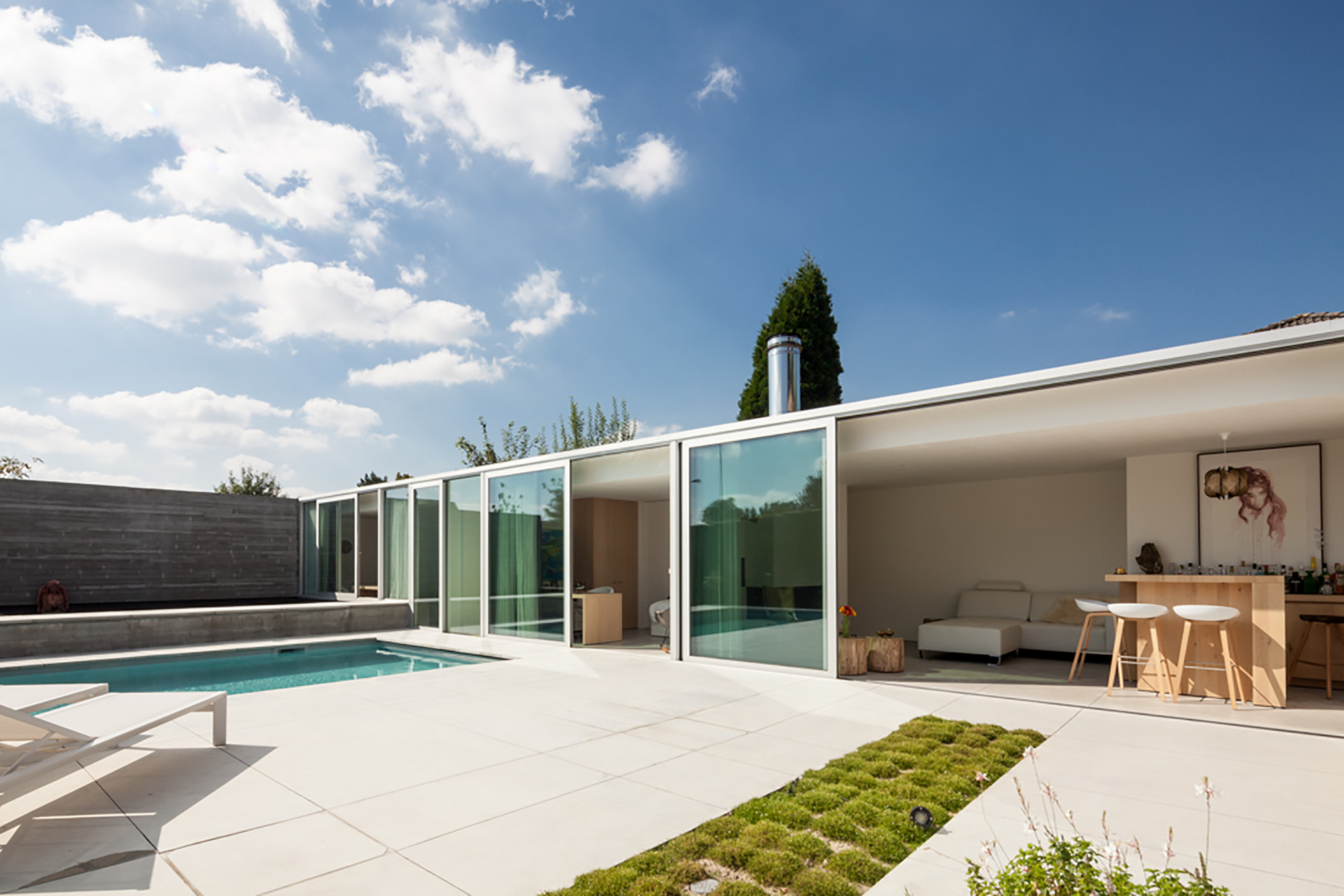 The overall impression is that of an abstraction of garden walls, concrete floating walls of a building that could be located on a hill in Switzerland. Because of the embedded character , own climate (no wind) and swimming pool the courtyard makes the residents feel like they are on holiday in their own house