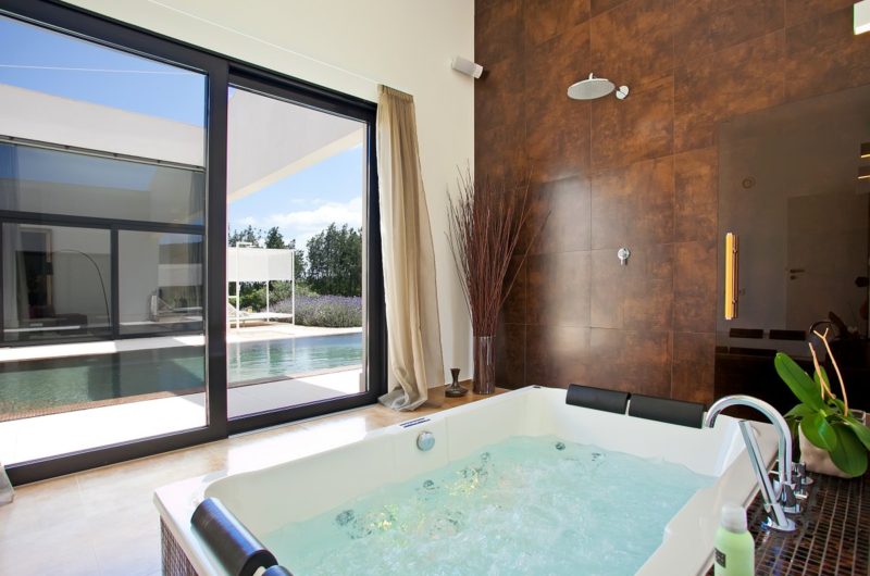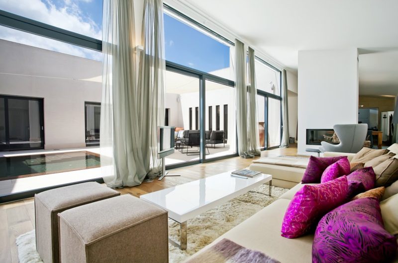 It features 400 square meters of living space which includes the entrance hall with piano, a modern fitted kitchen, four bedrooms, three bathrooms, and a master bedroom with dressing room, a bathroom en suite, a spa with sauna, a shower and a Jacuzzi, an office room, guest WC and a utility room. The living room is separated by the dining room through the fireplace.