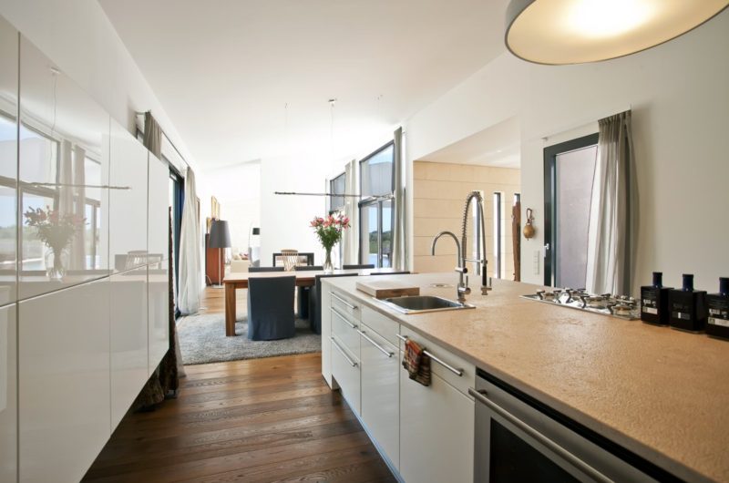 Among other facilities, the house boasts underfloor heating, insulated exterior walls, aluminum double glazed windows and siding elements, lush bathrooms and also a fully equipped kitchen.