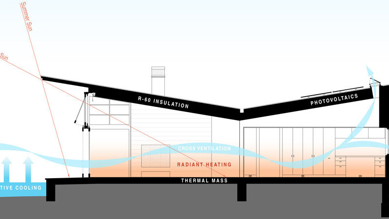 It’s an eco-friendly home, because the roofs are equipped with photovoltaic and solar hot water panels and the entire house is heated with a radiant system in the stone floors and cooled with the help of the operable windows, having no need for air conditioning in the summer time. It was built by using many green materials such as fly-ash concrete, formaldehyde-free casework and denim insulation.