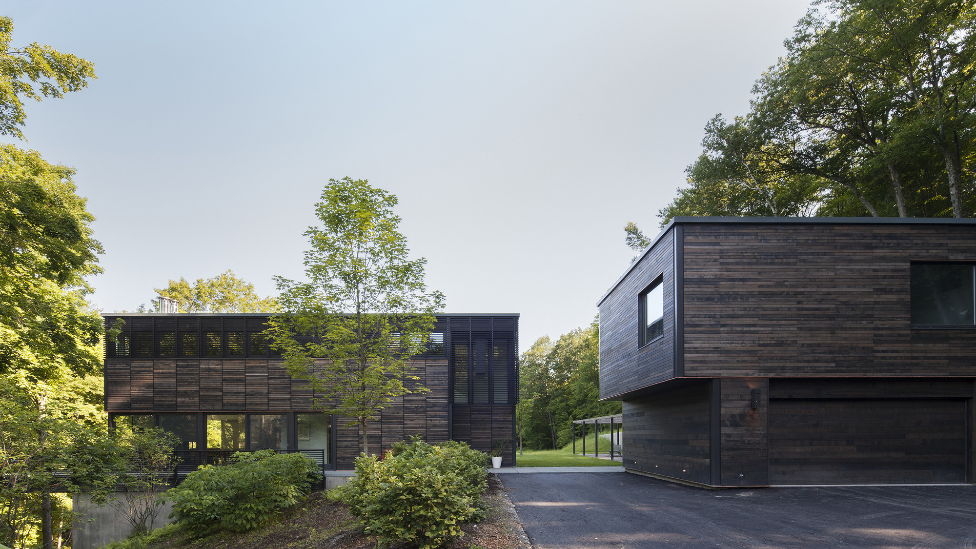 This home is located in a small Berkshires township on a densely wooded, 16-acre property. The site initially afforded no views and little sun penetration, its topography defined by a steep slope, a vertical rock ledge along its east edge, and a creek prone to seasonal flooding to the west. These dramatic elements informed the siting of the buildings and the ways that landscape, views, and daylight could be integrated into the design.