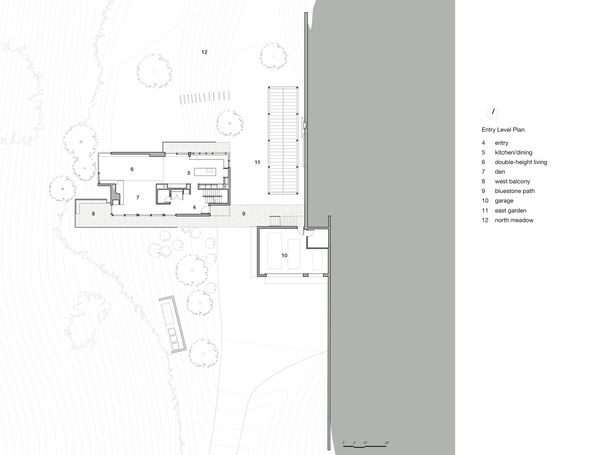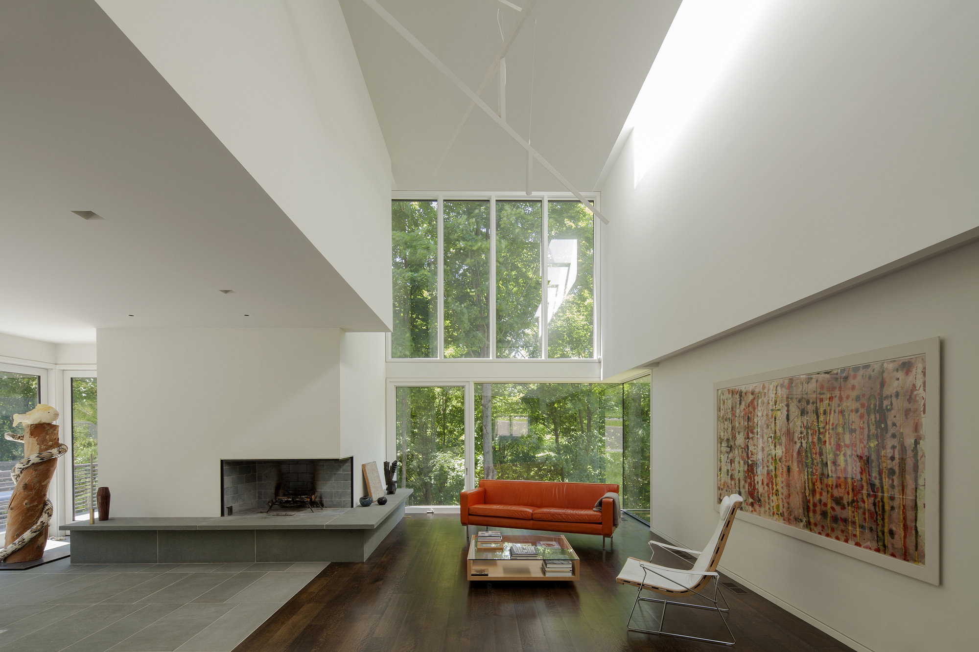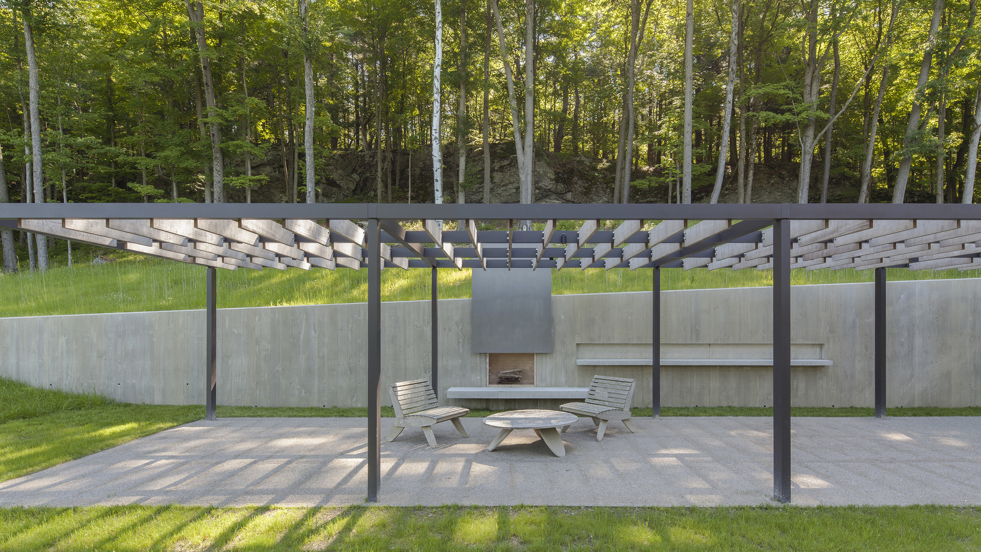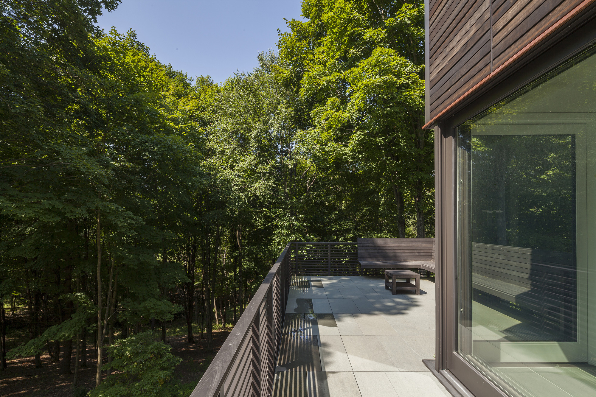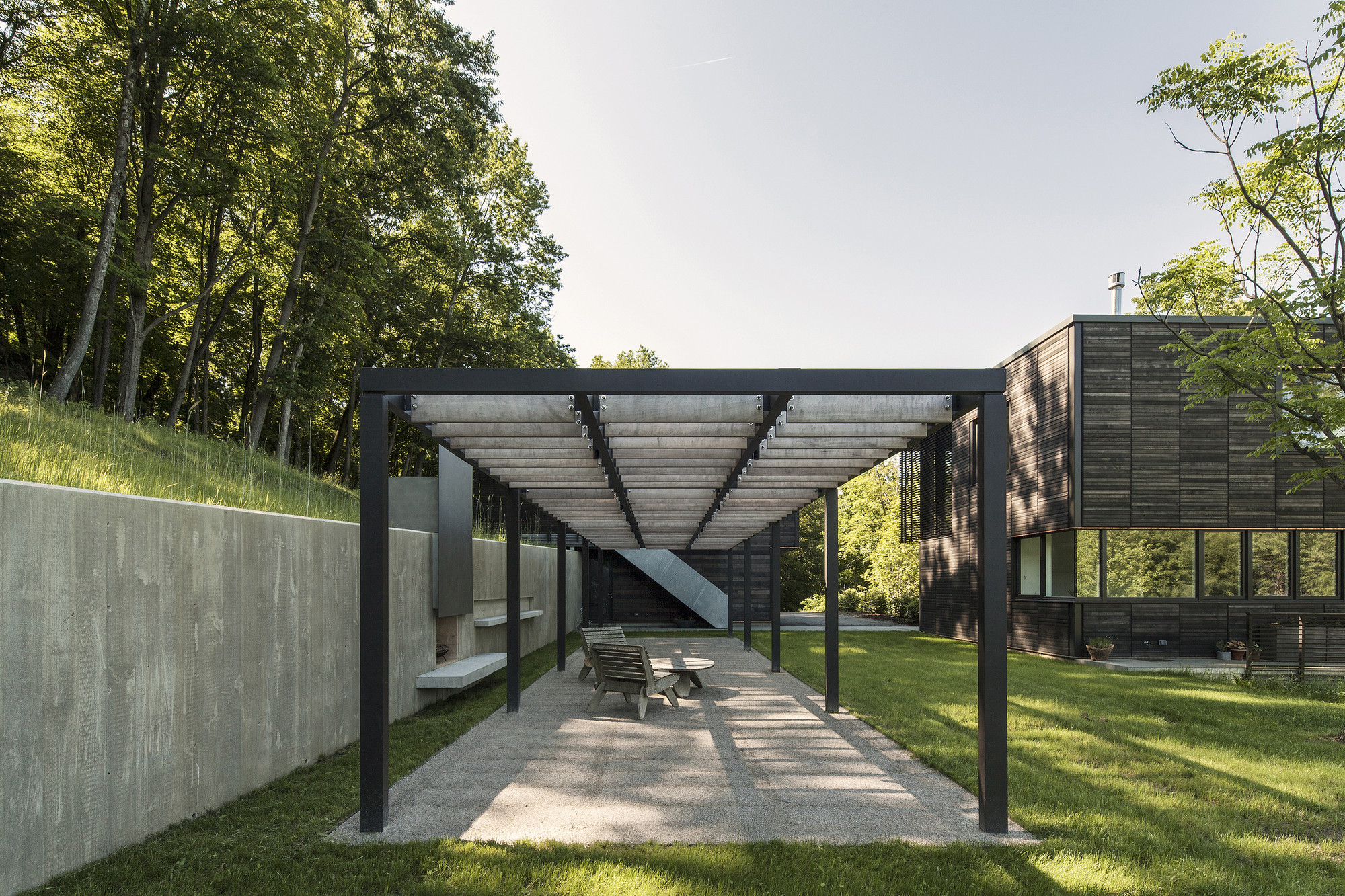 The project embraces a “machine in the garden” design approach, where contemporary vocabulary and minimal form underscore the relationship between built work and natural landscape. AW collaborated closely with Cambridge-based landscape architects Reed-Hilderbrand on both the development of sustainable foresting as well as the design of garden terraces and architectural landscape walls. The initial design strategy focused on manipulating the site to preserve as much of its natural topography as possible. A 200-foot long board-formed concrete retaining wall runs north—south along the site’s east edge to expose new plateaus for buildings, garden, and meadow. Clinging to this wall, the guesthouse anchors the building assembly in the steep hillside, while the main house and deck project out from the landform into the treetops. A linear bluestone path connects guesthouse and main house, and leads to the west balcony in the tree-tops, looking out over the creek below.