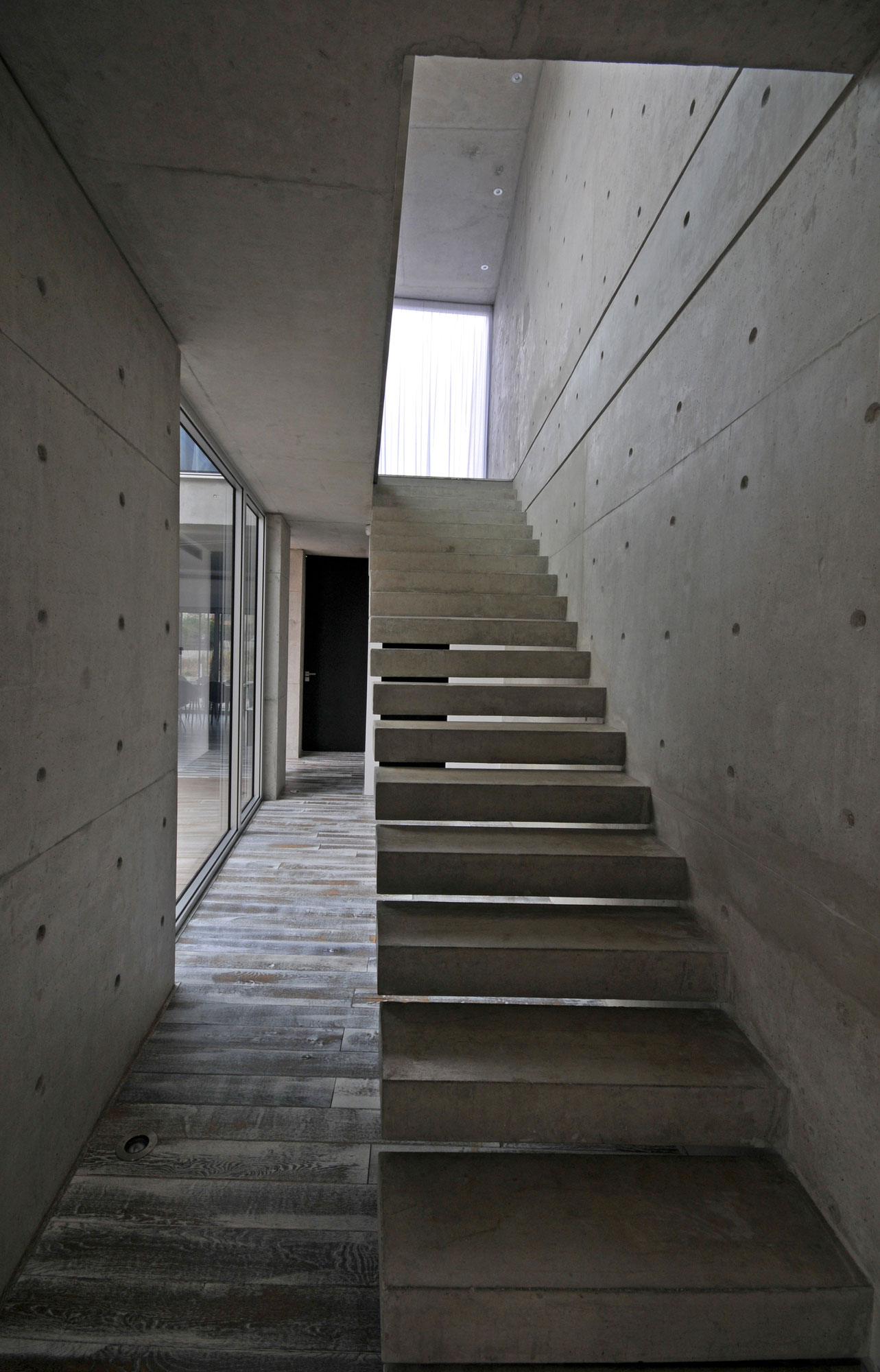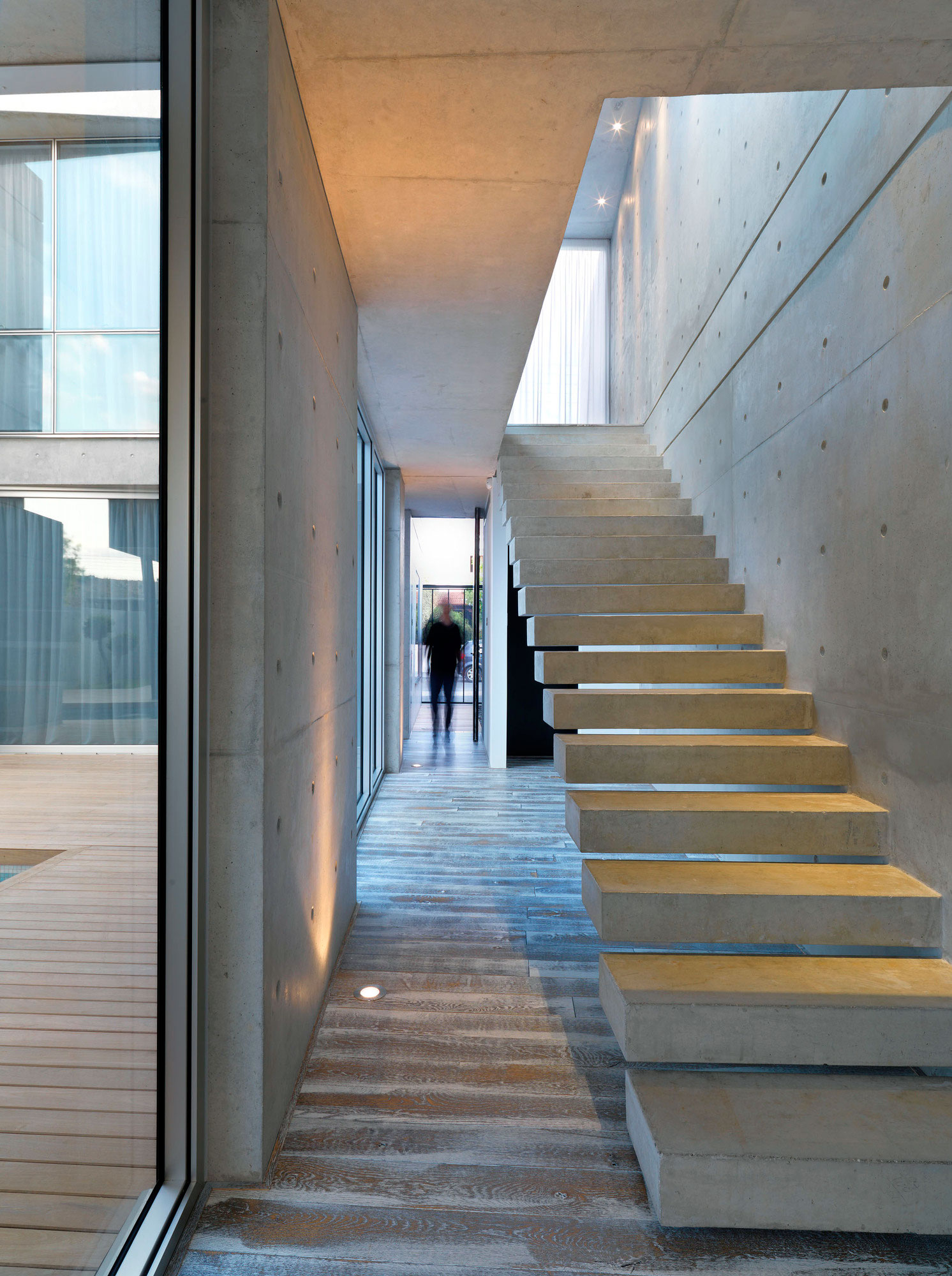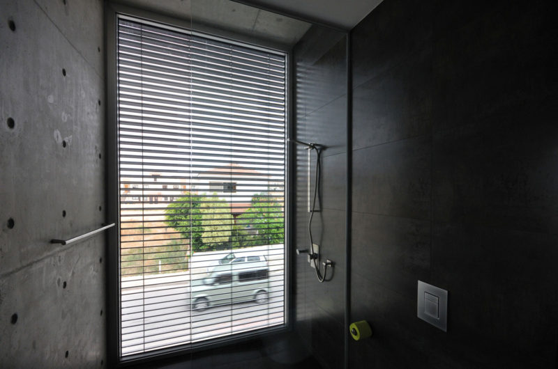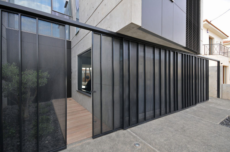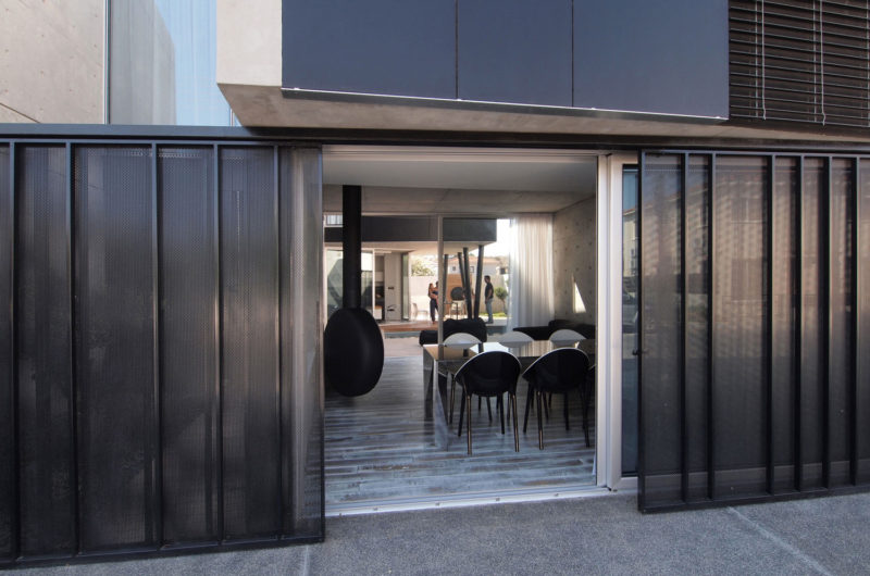 The indoor-outdoor interplay is variable and can be controlled by the owners according to their mood and the time of the day. Retractable shading devices, perforated metal panels, and simple curtains can be opened or shut to modify the amount of openness towards the courtyard and the neighborhood. At the same time private and open, this is an excellent home for a modern family.