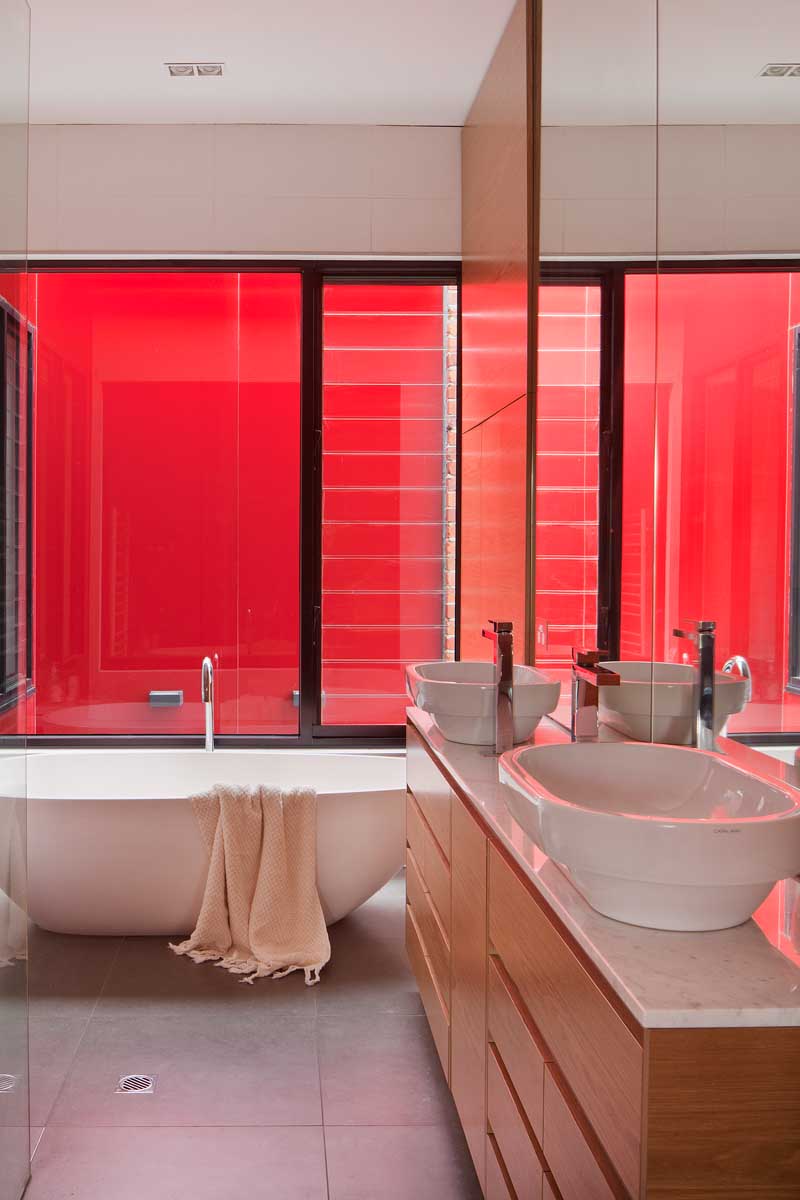 Both ensuite and bathroom view a light court insertion clad in red glass.