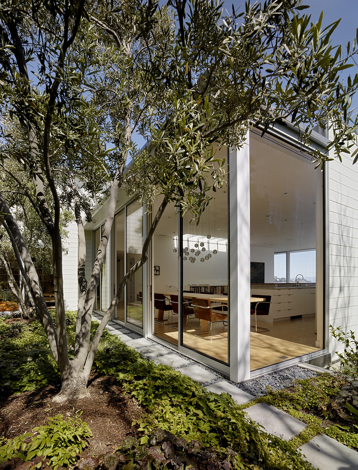 Inside, floor to ceiling windows and generous ceiling heights allow the living spaces to flow uninterrupted from the lush backdrop of the hillside garden, to the broad panorama of the bay. As a result, the soaring view is grounded by a strong connection to the land.