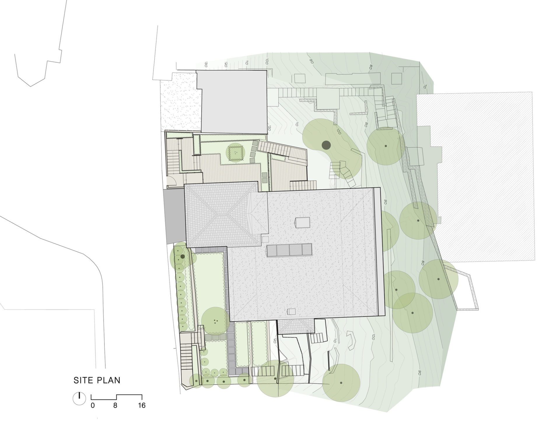 We replaced the original aggregation of roof shapes on the upper level with a simple, light-filled building volume. A cascading series of garden terraces creates an inviting entry sequence along the north side, allowing the original front-yard to be developed as a private garden.