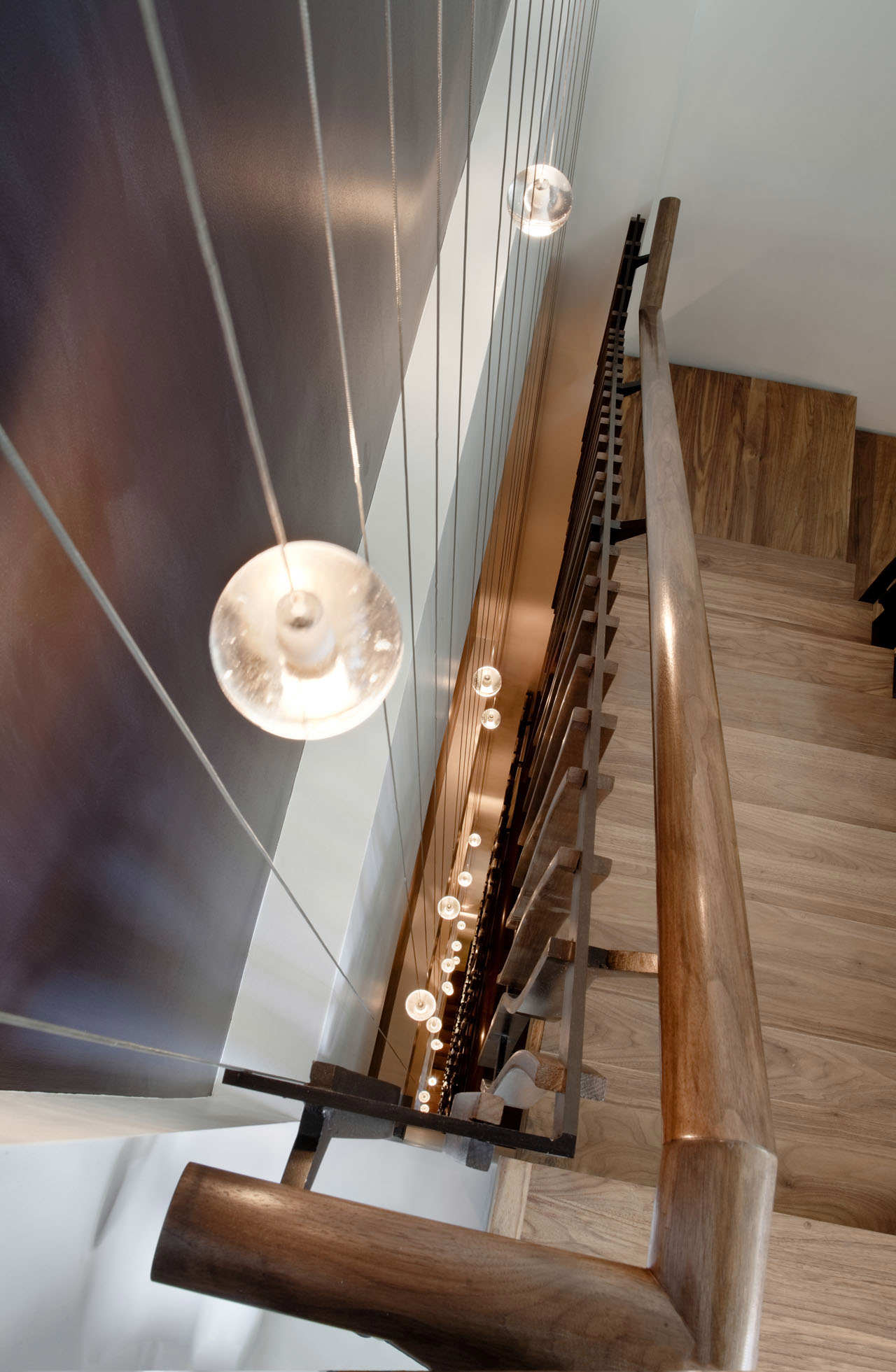 An open-air courtyard is sited at the second floor where the old and new are interconnected, also housing a living room, a dining and kitchen area and a media room. On the roof, a beautiful irrigated roof garden covers all the available space and floods the living spaces with light.
