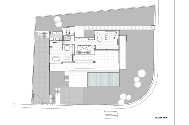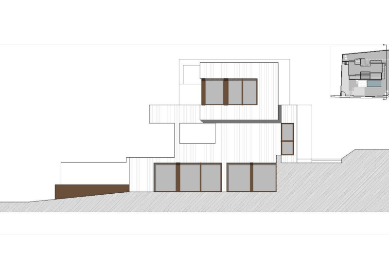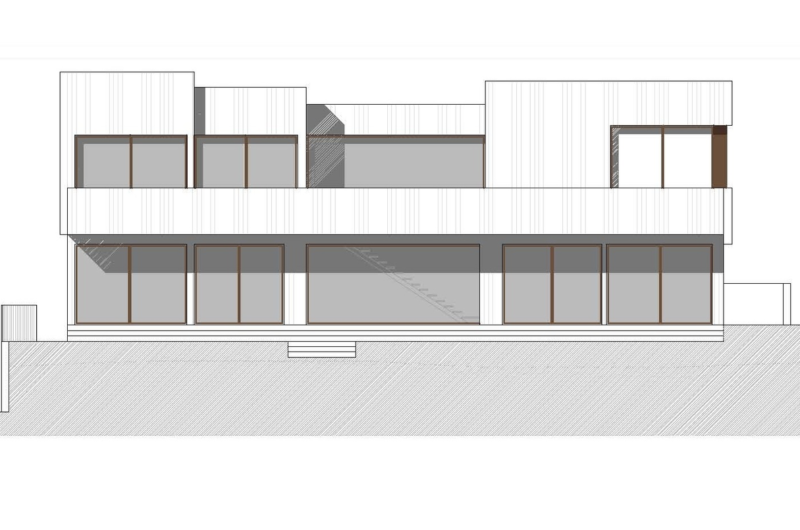 The highest spot of the residence is the north-east corner where the main entrance of the plot is situated. A special element consists in the contrast between the north façade and the main entrance, because while the north façade presents massive and tectonic elements, the entrance hall is much lit.