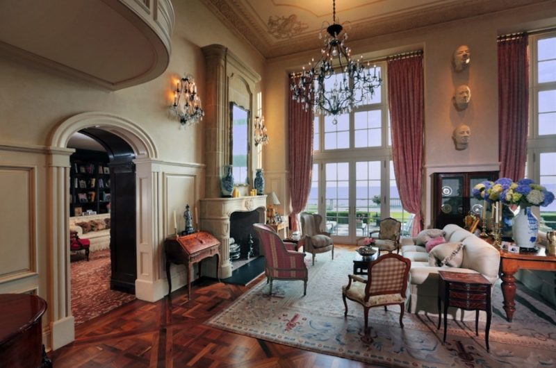 The huge French doors are the elements that stand between the interior space and the expansive granite terrace, while the entry hall unveils two limestone staircases overlooking the elegant living room.