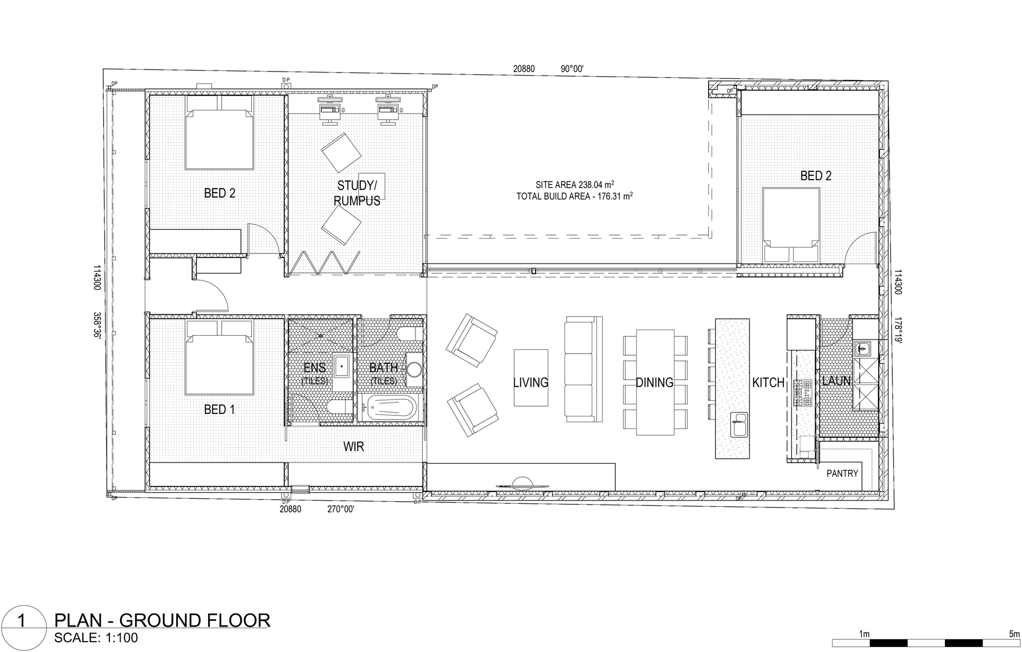 The first challenge was to overcome the limited site size – 238m2 – in order to fit the brief, which called for an open plan living, dining, kitchen, rumpus room, bathroom, walk in pantry, walk in laundry, master bedroom, ensuite, walk in robe, 2nd and 3rd bedrooms and an outdoor area. This was accomplished by building around “the back yard” in a “U” shape facing north. Materials and finishes were selected to be hard-wearing and maintenance-free, to endure the enthusiastic creativity of young children, while remaining sympathetic to adult sensibilities. The group objective was to create a highly contemporary space with enduring and classic features.