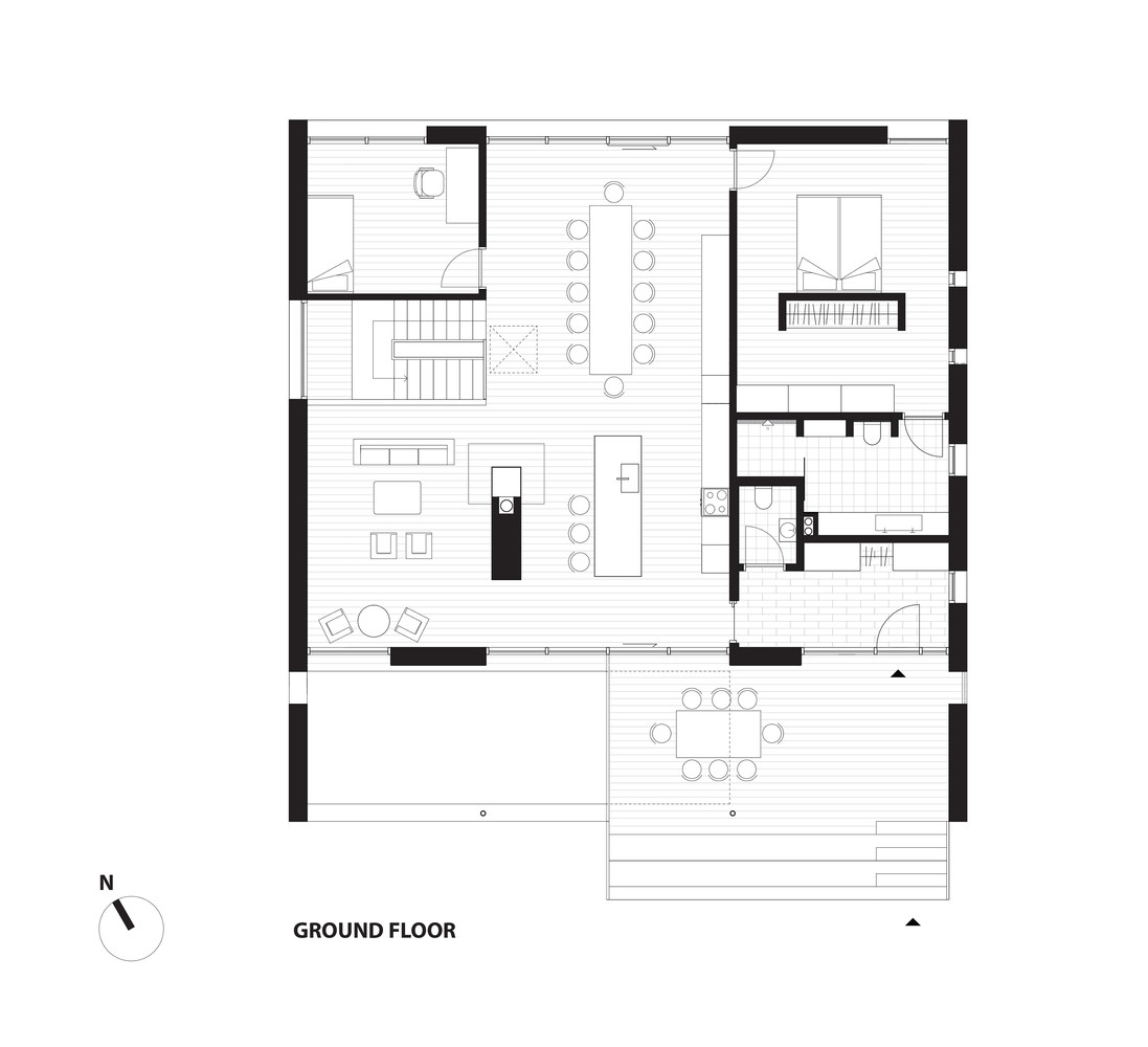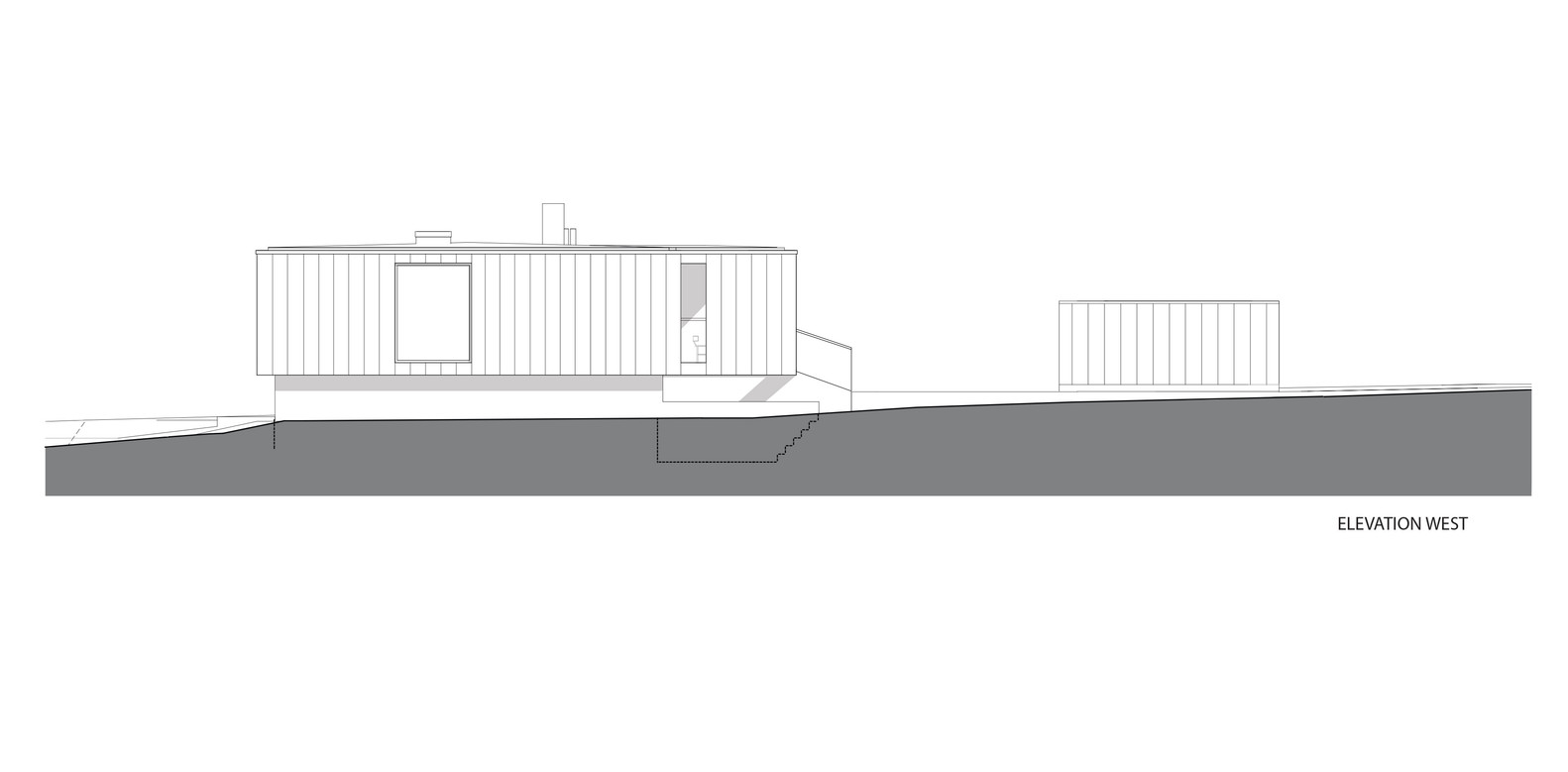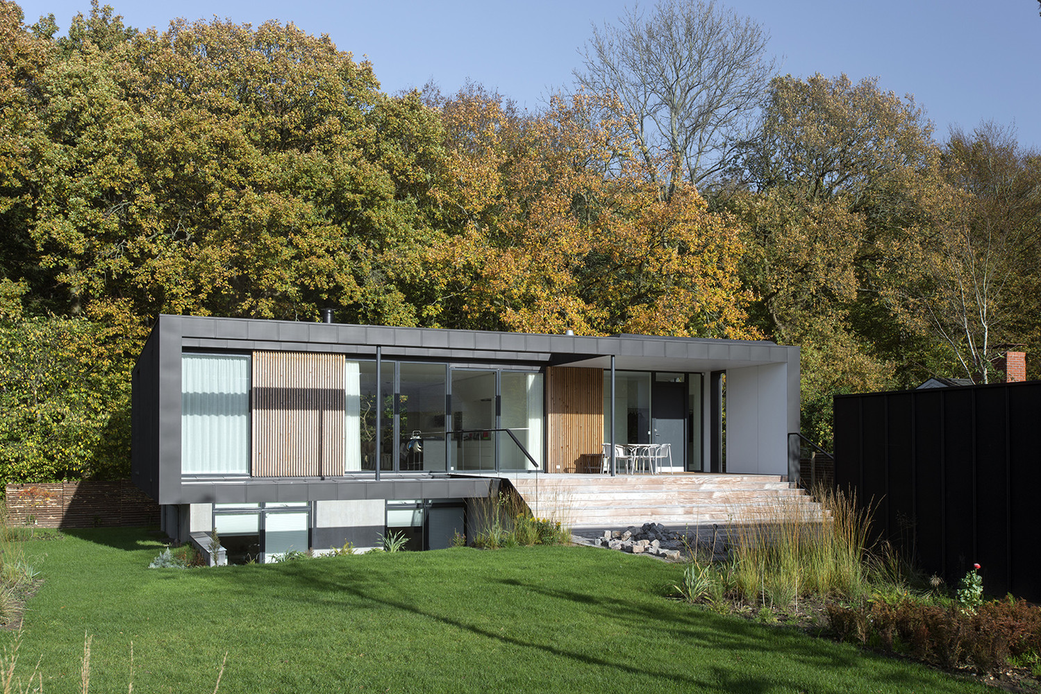 The solution was a partially underground parterre floor which acts as the building’s base, with children’s rooms, playrooms and access to an outdoor patio. The upper part, covered with dark patinated zinc, is seemingly hovering above this base. It contains living rooms with multiple aspects, facing the forest and treetops on one side, and receiving plenty of daylight from the other – and with access to a raised south- facing wooden terrace with sitting-steps.