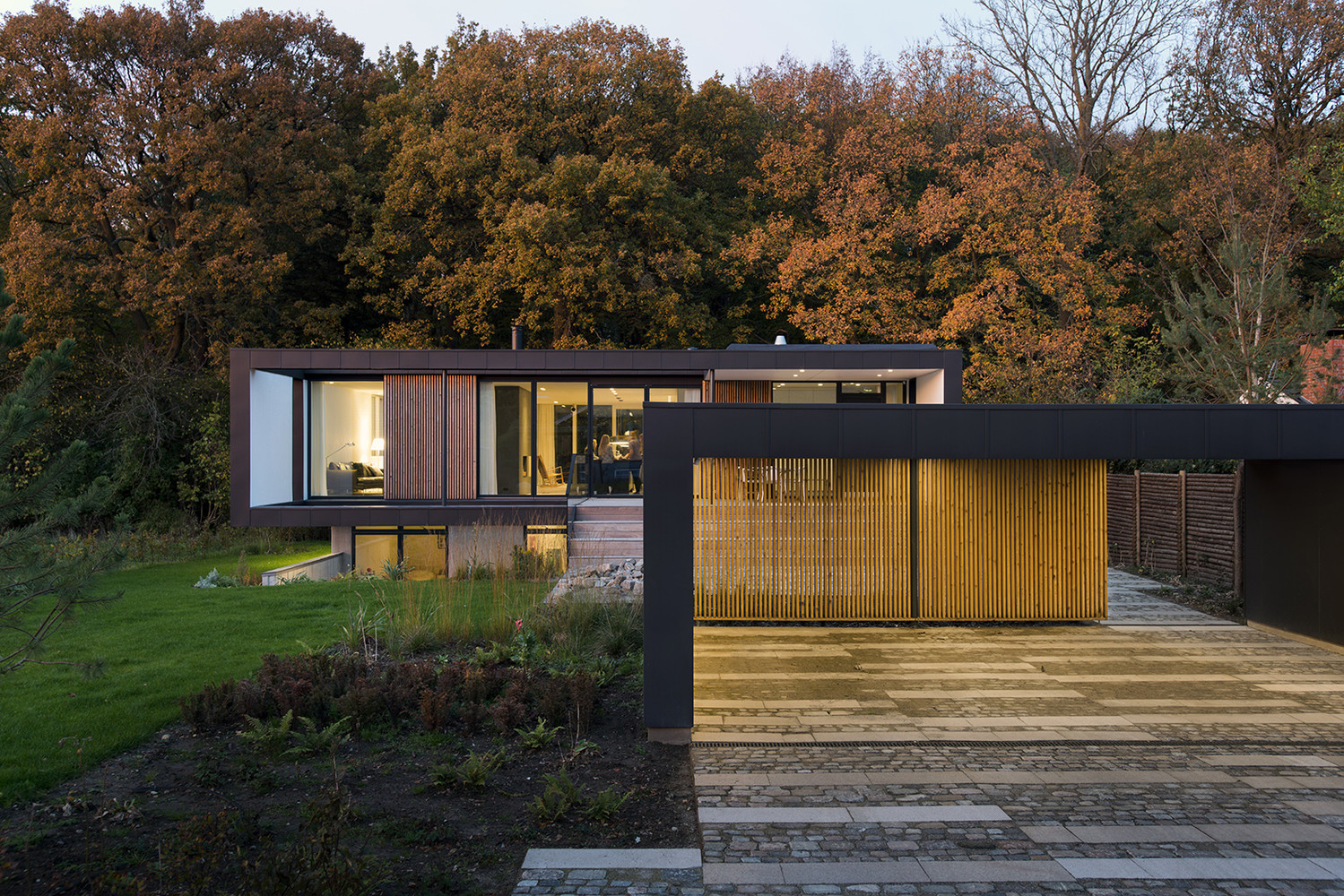 Above this parterre floor is a second level that is enveloped in dark patinated zinc. This level houses the living rooms, which feature breathtaking panoramas of the nearby forest thanks to a selection of glass panels. Villa R is a perfect home for a small family with children, as it provides modern living conditions and privacy for all family members. Its highlights include a cozy dining space with enough seating for eight as well as a fully equipped kitchen, minimalistic bedrooms designed for comfort and a spacious bathroom with a hot tub and a shower.