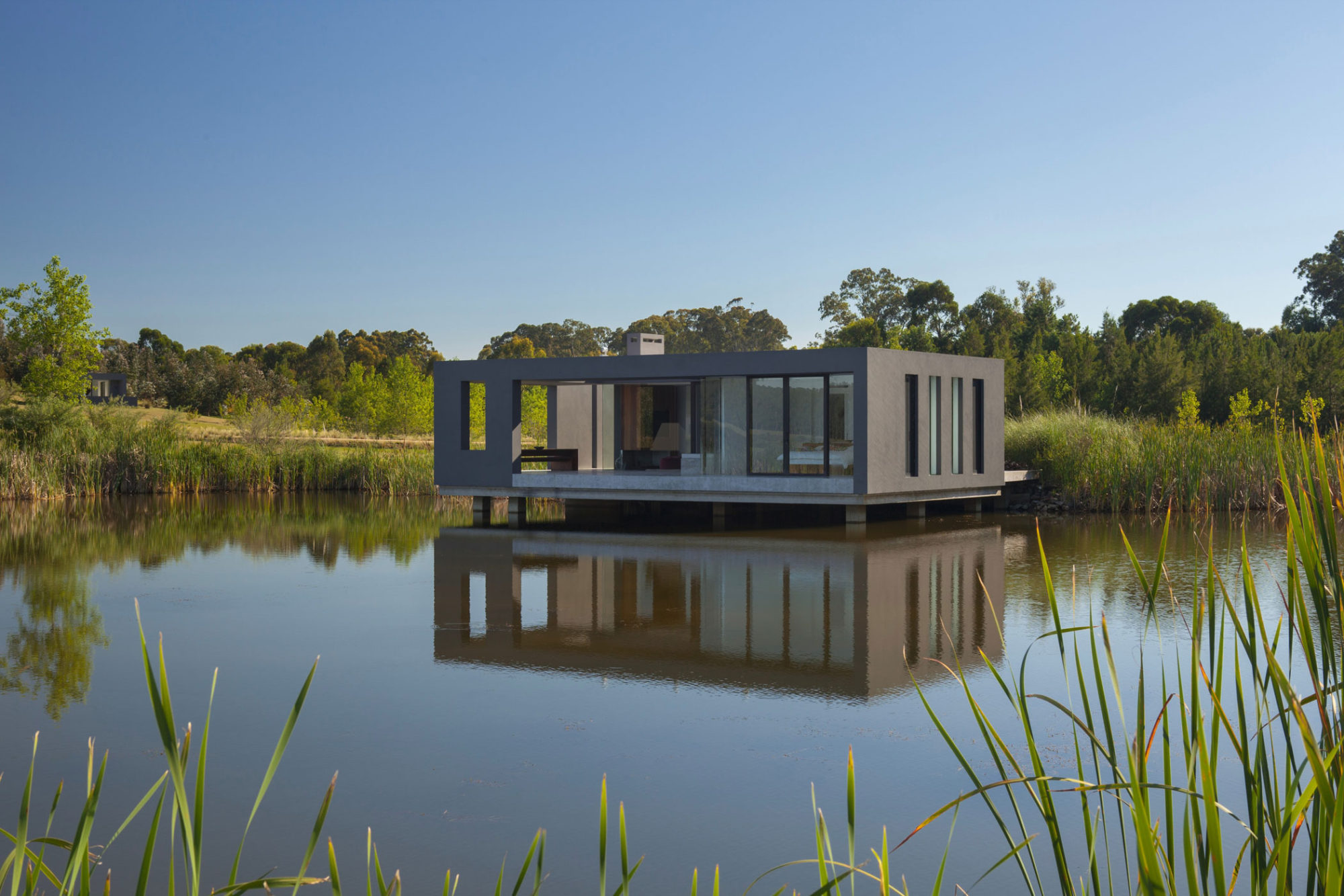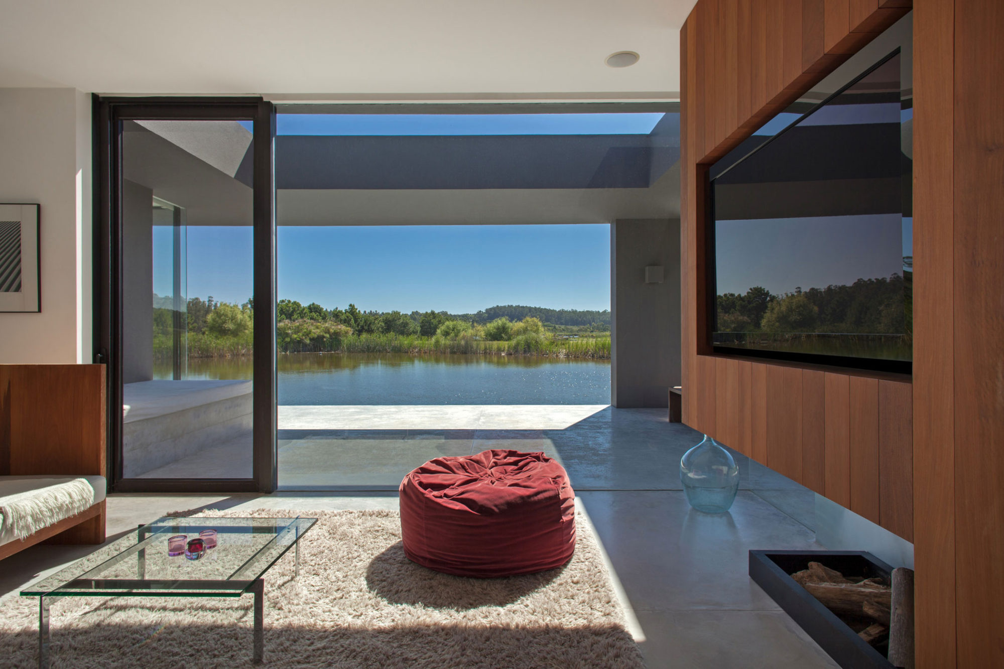 The project emphasizes the relationship between the interior and exterior, as it features multiple windows and sliding doors, many of which extend from the floors to the ceilings. One of the volumes was built directly on the banks of a beautiful lake, and it extends into the water. It includes a bedroom, a small lounging space and a bathroom. Another body includes a large living room and a dining table with enough seating for 12 people. It boasts floor-to-ceiling glass panels that overlook the lake and the forest beyond. Should the owners wish to relax or socialize indoors, they can always spend some time at the sauna. Otherwise, they can gather around a fire after dusk and feast their eyes on the exquisite surroundings.