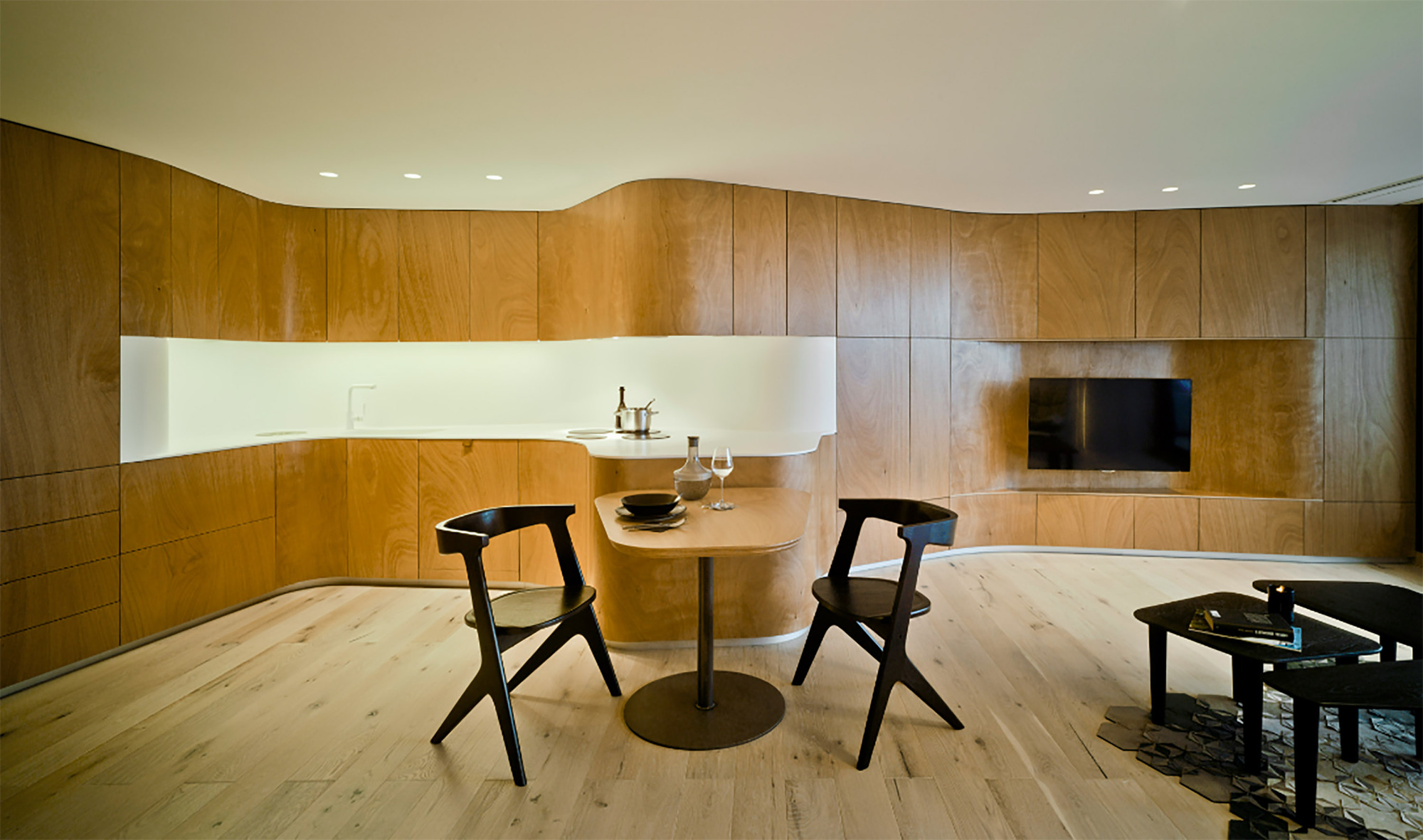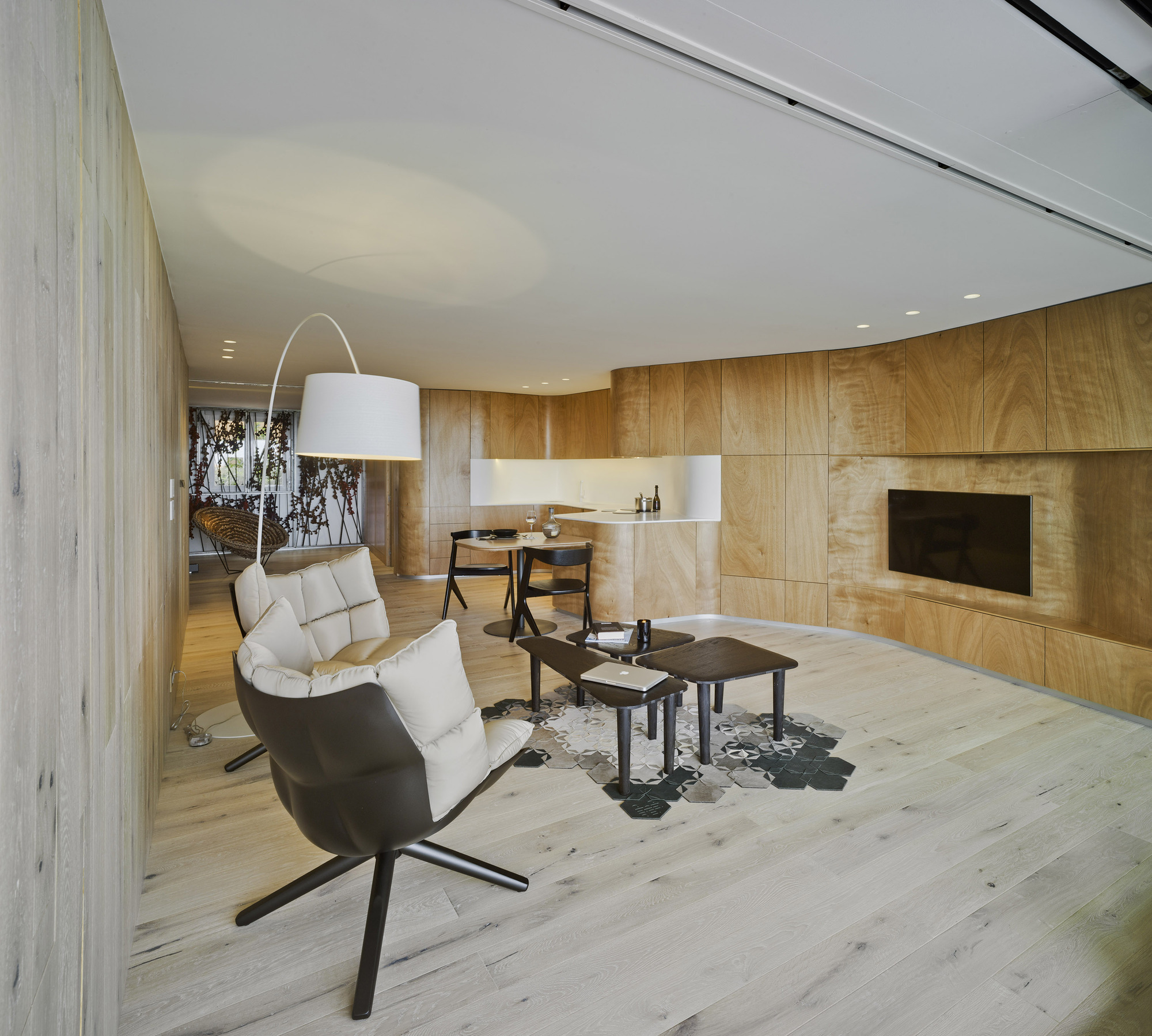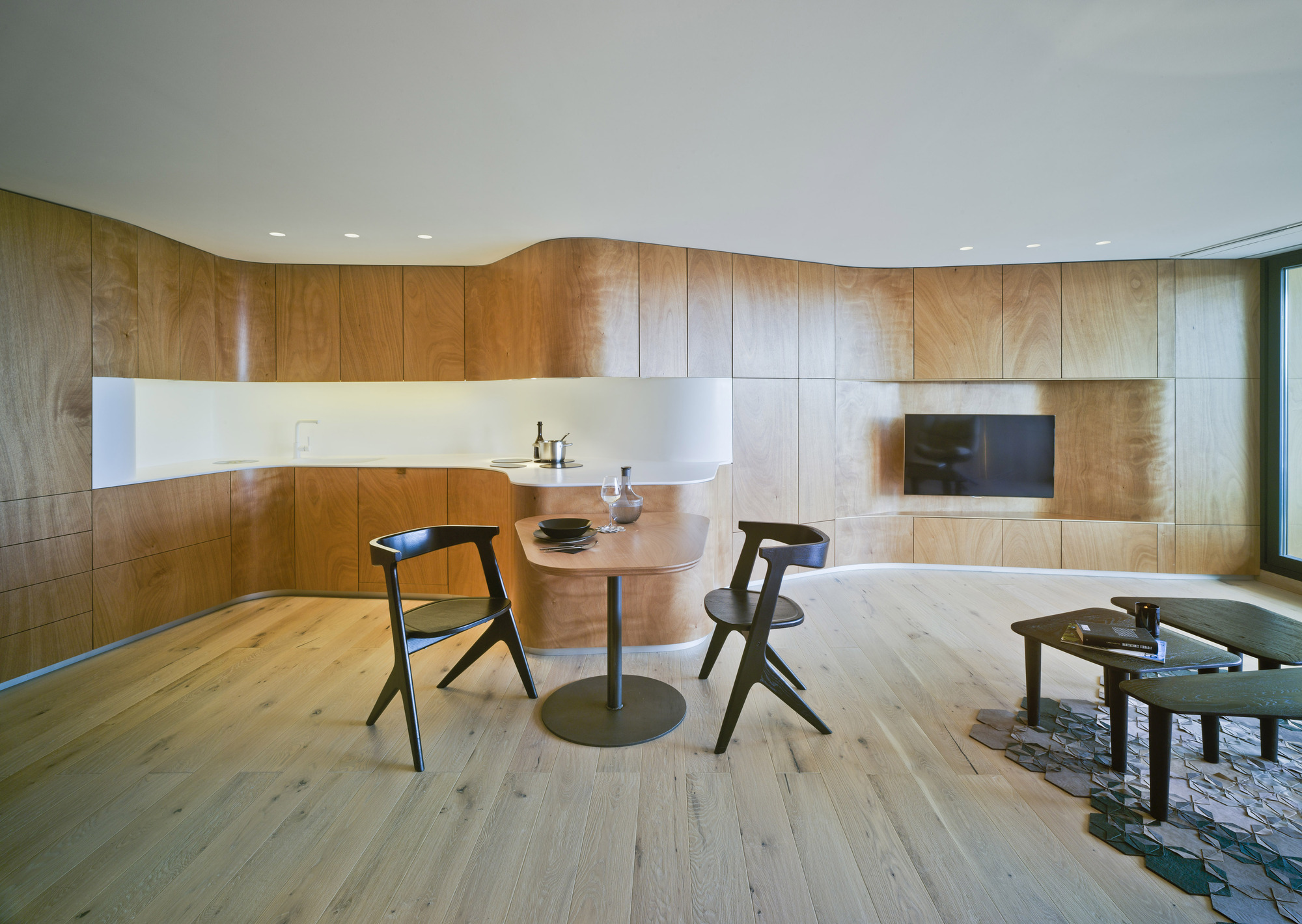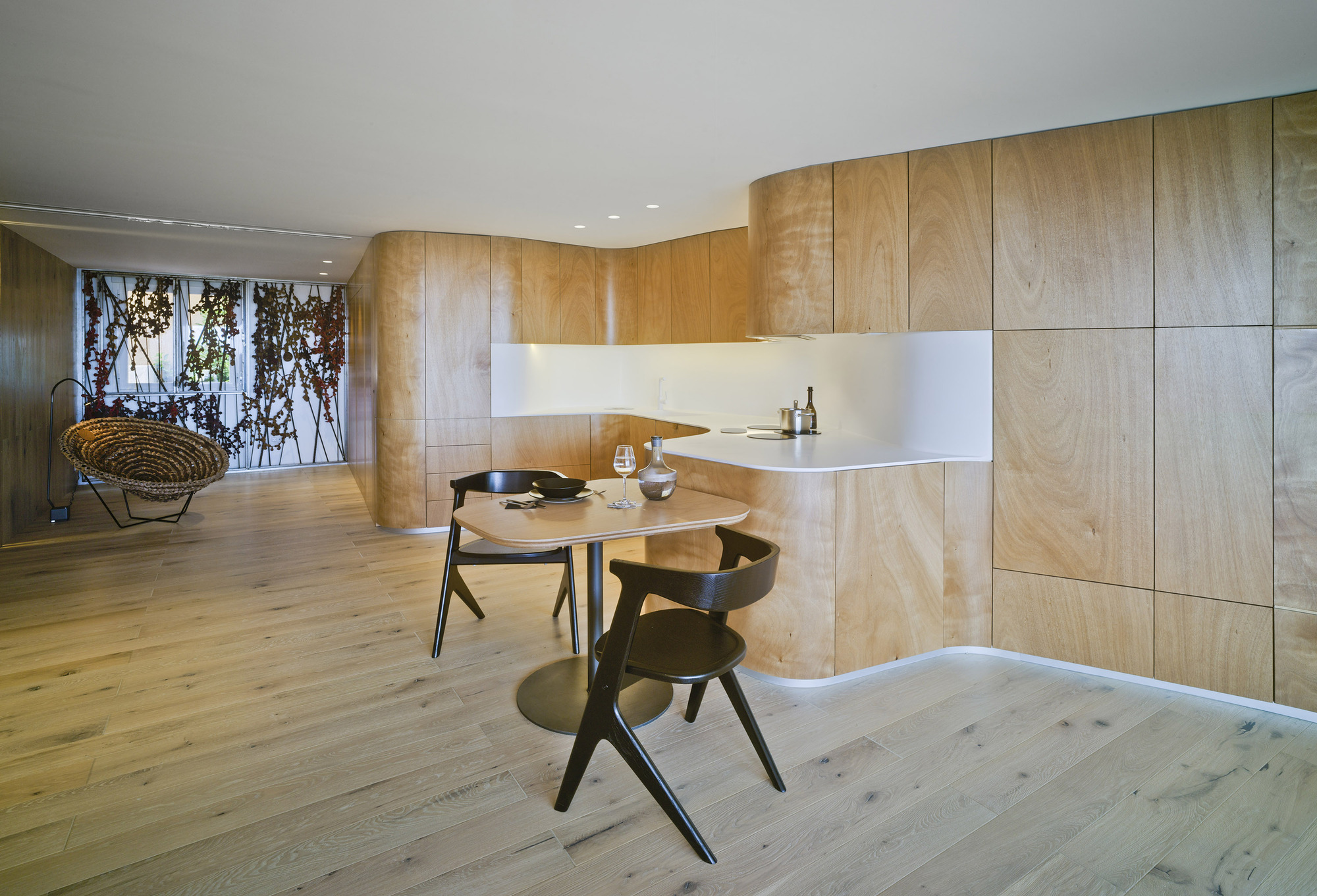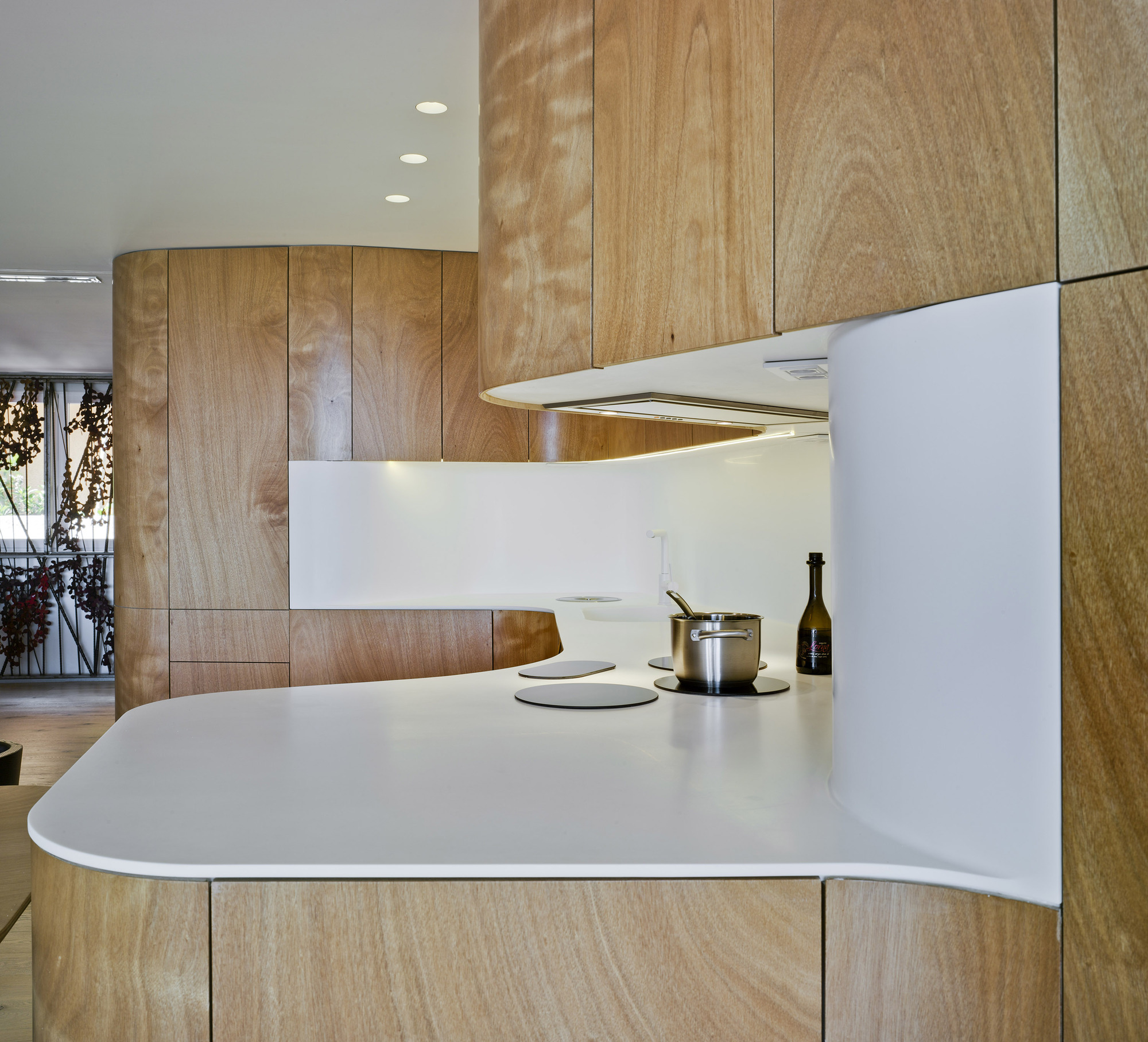 In the first piece, which is the narrower of both, the master bedroom and the main bathroom are placed; and in the second one the space is starred by a combination of kitchen, living, and dining all in one. In order to do so we took as a reference one of the works of the well-known photographer Edward H. Weston, because of the beauty shown while capturing the curves and the quiet of the movement. This starting point helped us to design a piece of furniture capable of traveling from one end to another of the house and of becoming the main defining element of the space.
