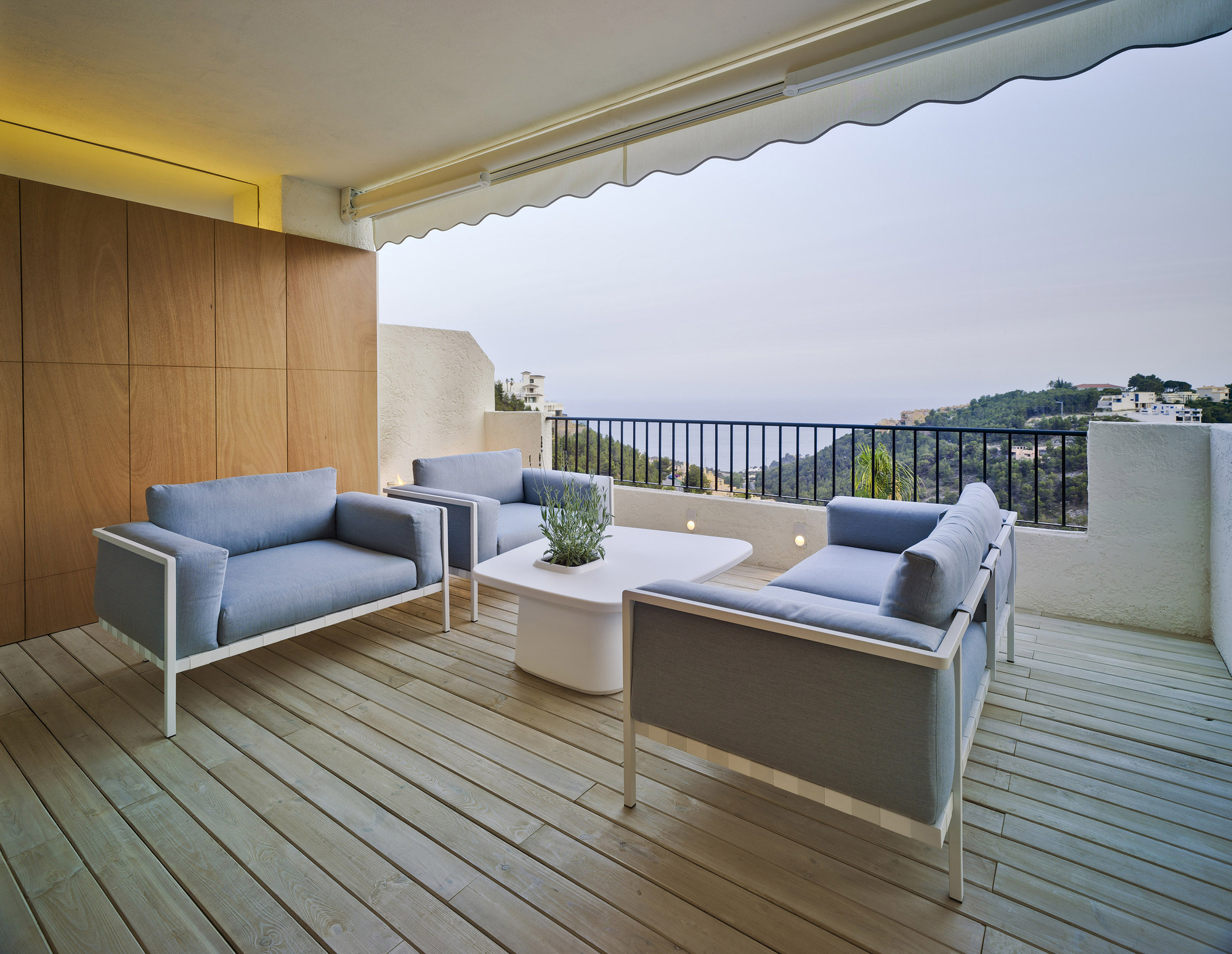 This house is located at the ground floor of a building which is found among gardens and by the sea, up in the hill from a city called Altea, in Alicante (Spain).In the very beginning this house was unconnected to its own surroundings and therefore, the first decision to make was already clear: to set the floor free so it could be related with the whole outer environment, but especially, with the sea in ahead of it. Because of this arrangement the house remained split up in two slices facing south and north.