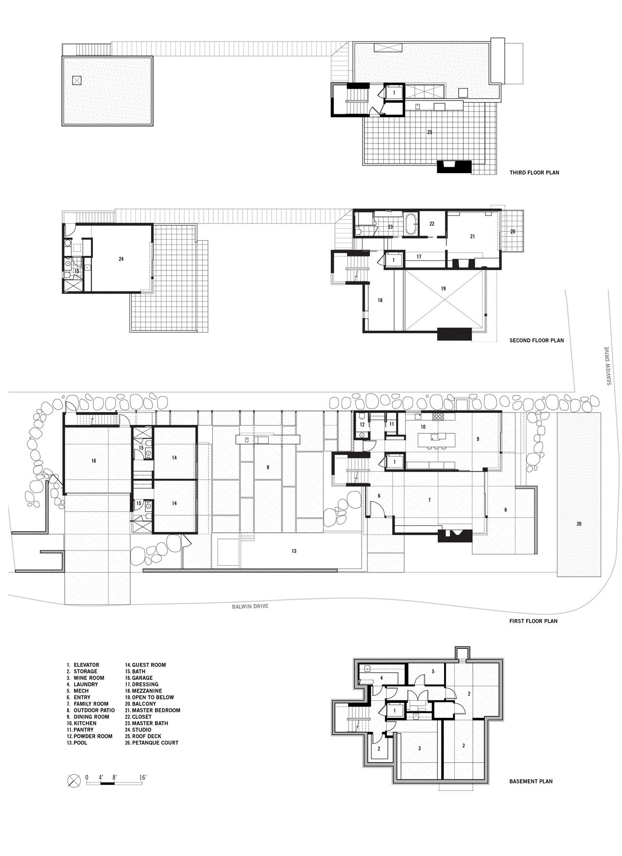 On the ocean side, the two-and-a-half-story main house features a double-height living space, with full-height glass doors that open the interior onto the exterior spaces. A mezzanine is oriented towards the view. At the end of the stair tower, a full-sized roof deck accommodates various entertaining configurations and provides strong connections to the landscape and views beyond. The front yard even incorporates a petanque court, a favorite pastime of the client.