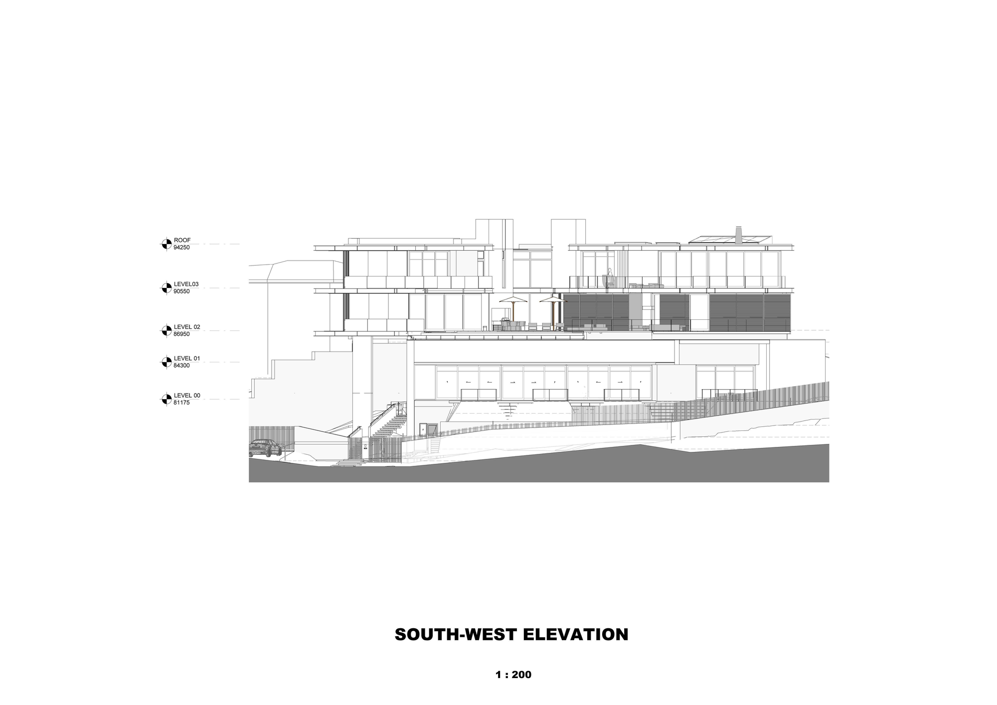 Landscaping was also a priority; 7 yellow wood trees were soften the verge and lush vegetation conceals retaining structures; on the level above a more formal lawn helps relocate the living areas on their elevated plinth.