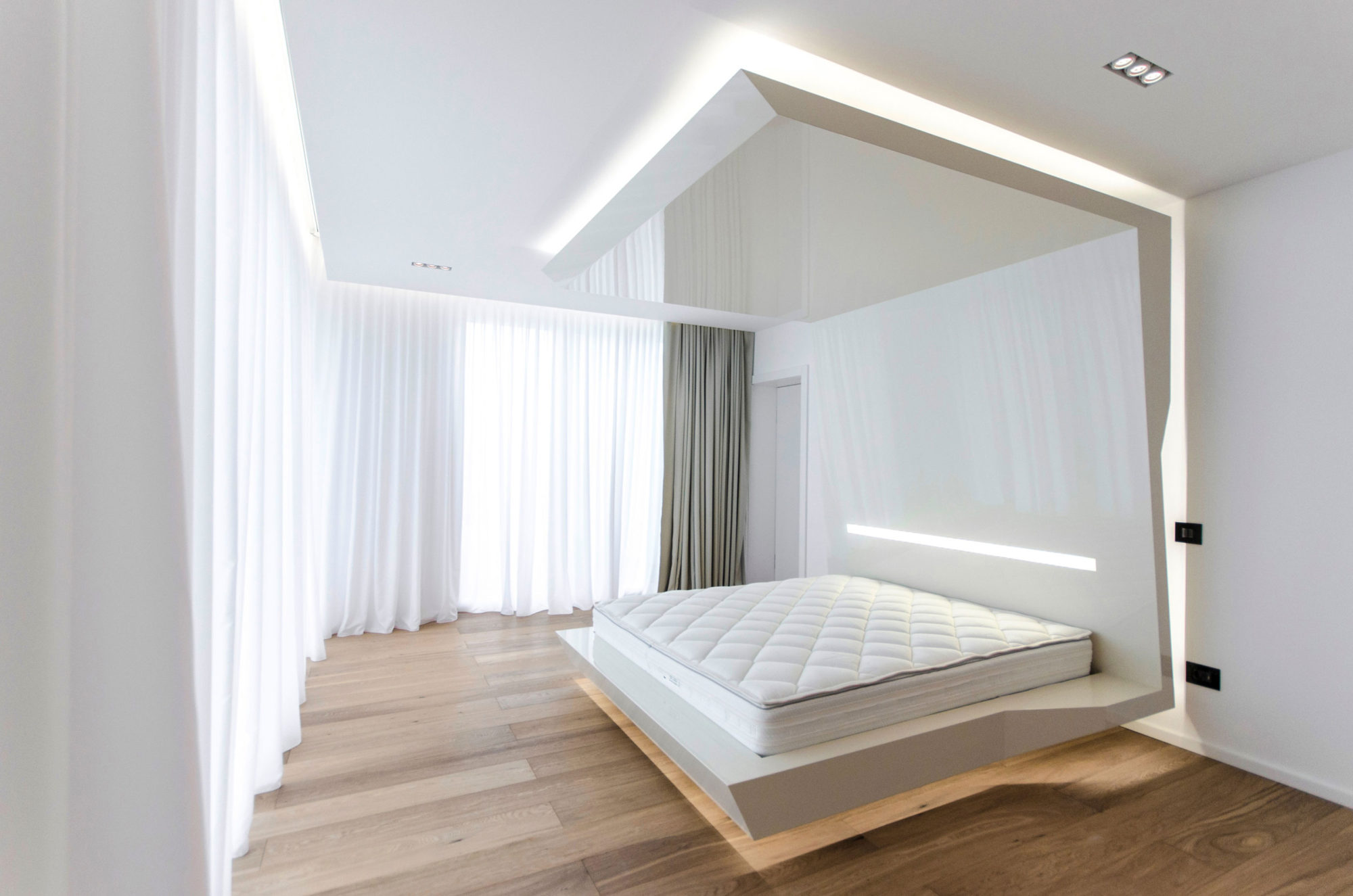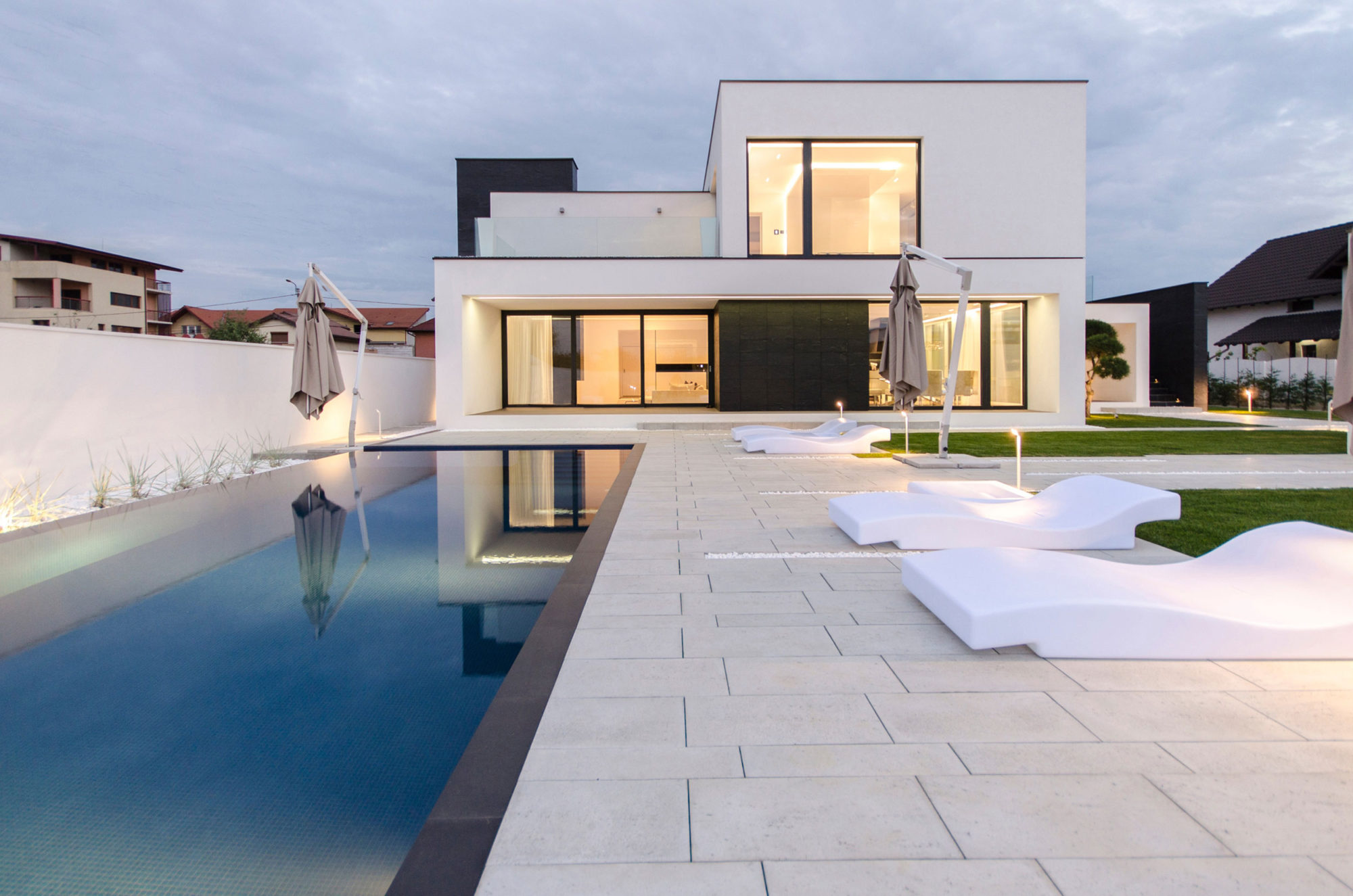 The white color highlights the volume’s horizontal/ vertical dynamics, and the black color has the role of visually stretching the openings and emphasizing the openings. The facades have different dynamics in relation with their cardinal orientation. The main facade faces east, and it accentuates the horizontality of the volumes, respecting the street dynamics. The southern facade has extruded volumes in order to offer the interior spaces as much light as they need. The western facade becomes more static, more transparent, opening the views to the backyard, a space for relaxation and swimming. The northern facade is more opaque, the openings are more fragmented, having a series of narrow slits that let the indirect lighting into the main space.