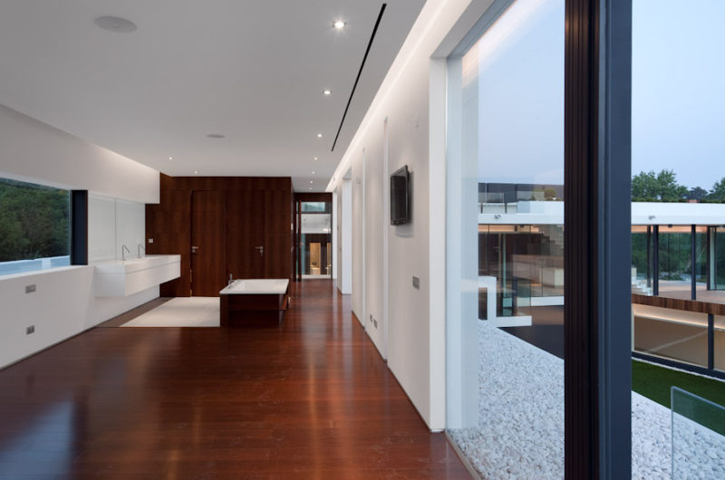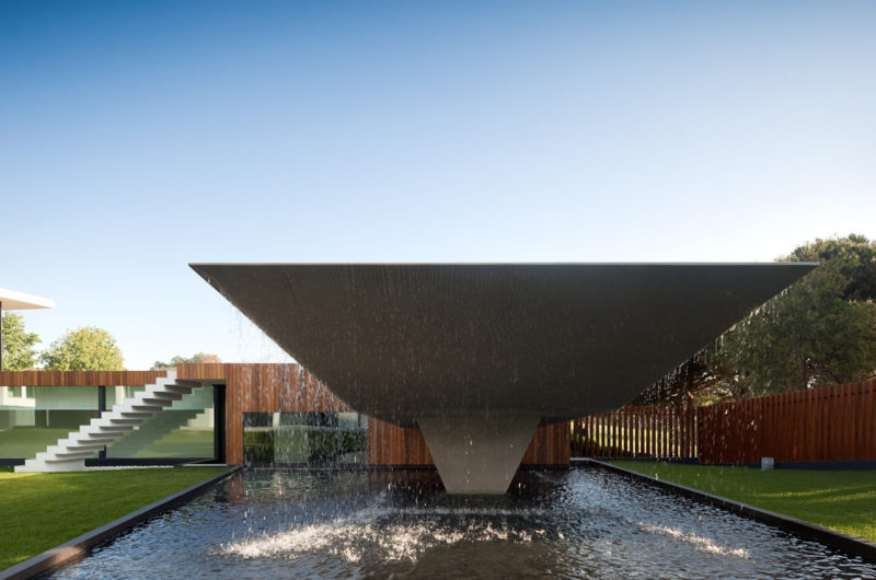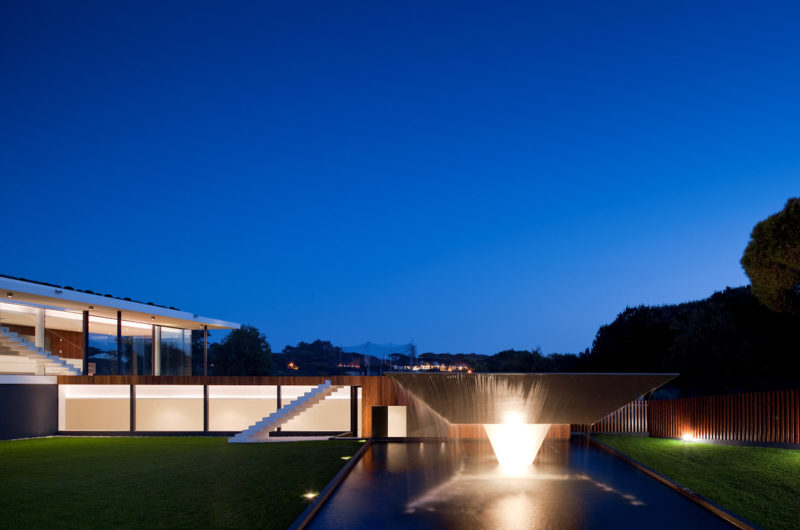 The U-shaped building creates the central courtyard and also delimitates the private and public areas. The architects chose as a main focus element of the house the infinity swimming pool. It is suspended over the courtyard and generates a cascade of water that flows into the lower level pool. Water also flows into the spa area inside the house into the indoor pool. Besides the sculptural effect of these pools and cascades of water, the continuous stream creates a relaxing sound.