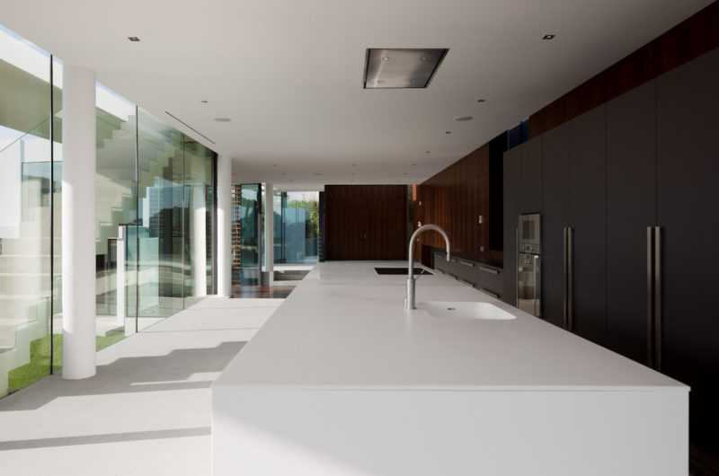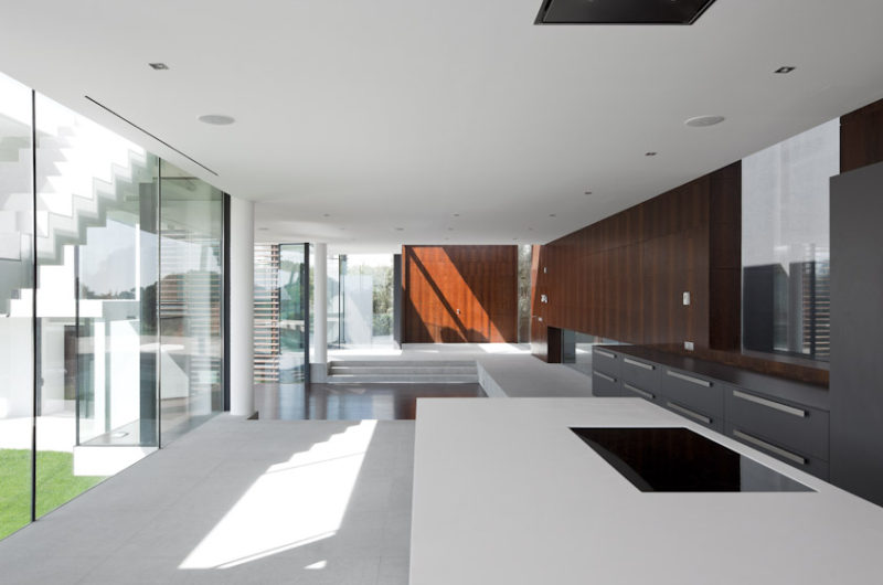 Opaque and see-through walls are used in the design of this residence to create a fortress-like façade. Just like the pool water, spaces flow one into the other, from the interior to the exterior. Sliding doors were used to create this feeling of openness and connection.