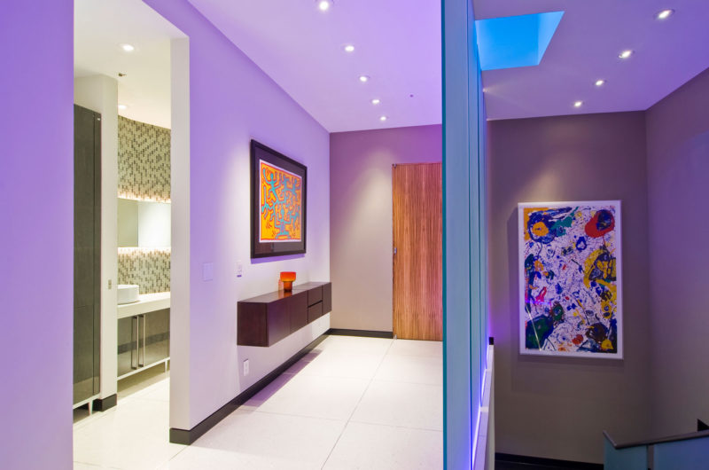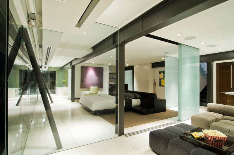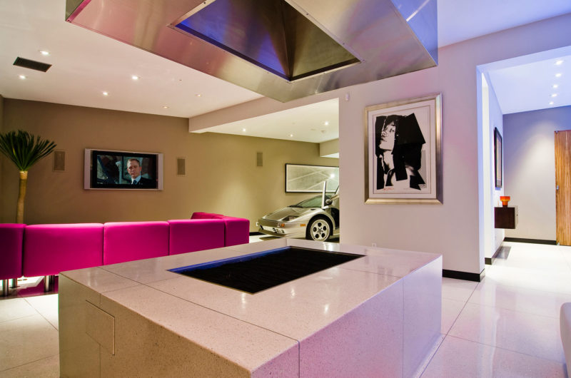 The master suite along with the theater are found downstairs, the entire house being perfected by symmetry, unifying materials and all the comfort a bachelor needs. But how do you feel about parking your car, inside, next to the living room?
