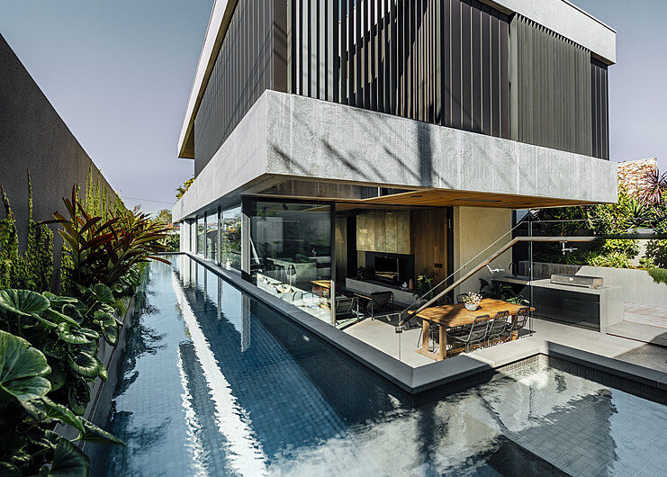 The family decided to make a radical change. They had their Victorian townhouse rebuilt and added a modern extension that opens to the sky. The Melbourne home was designed by Australian studio Mitsouri. Completed last year, this villa in the north-west Melbourne suburb of Ascot Valey sits on a long and narrow plot, surrounded by greenery and offering absolute privacy. The plot was able to accommodate a long swimming pool that was bent into an L-shape at one end. The blue surface is hidden from view when sitting in the living room. Architectural duo Melissa Lim and Matthew Murfett, who have worked together for more than 20 years, have a clear vision of the kind of buildings they want to create. Their homes respect the past, reflect the present, but are robust enough to be future-ready. From the outside, the ordinary building has glass ceilings inside that flood the interior with plenty of daylight. The main living floor serves both family and representative purposes. The secret is in the partially sunken basement, which has a game room, theater room, wine cellar, gym and a large garage with workshop. The pool wraps around the outdoor terrace and contributes to the self-sufficiency of the house. The unique bathroom overlooking the small atrium and the shell of the stone bathtub is a timeless masterpiece. Upstairs, the owners’ bedrooms and the guest room are both generously proportioned. The rooms have private terraces, sanitary facilities as well as dressing rooms with storage and extra large beds. The precision craftsmanship of all surfaces in the house is clearly the signature of Mitsouri Studio. They choose natural materials and rich textures because, in their opinion, it is these combinations that make a house a home.