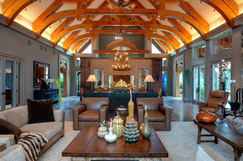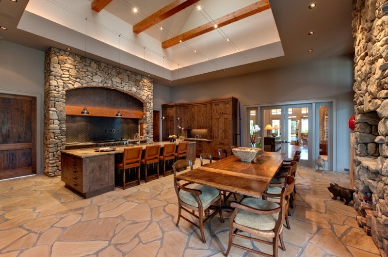 There are six stone fireplaces around the mansion, plus numerous custom details, such as Douglas-fir beams, black walnut floors, and a free-floating black walnut staircase that leads to the second floor. The colors and materials used for the interiors help create a nice and very inviting ambiance and a sense of permanent connection with nature.