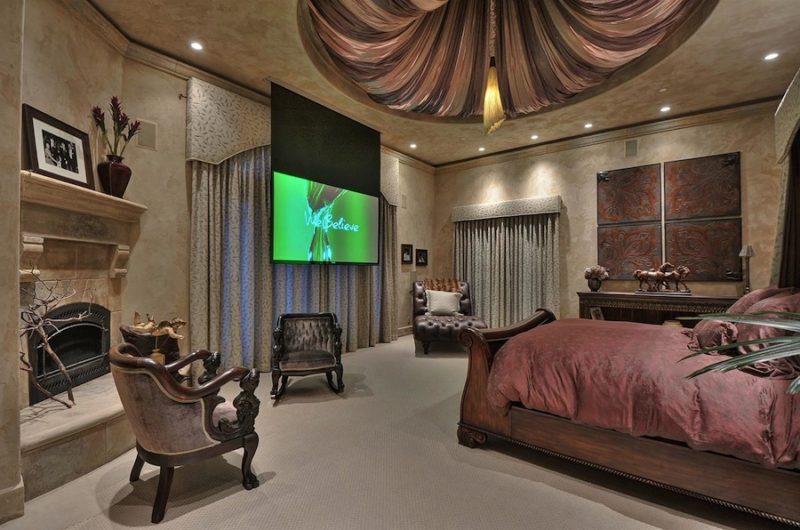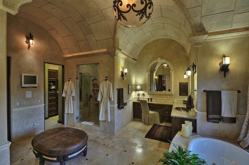 The master bedroom seems to be more than a day spa because it features leathered marble countertops, travertine flooring, plaster walls and intersecting barrel ceilings.