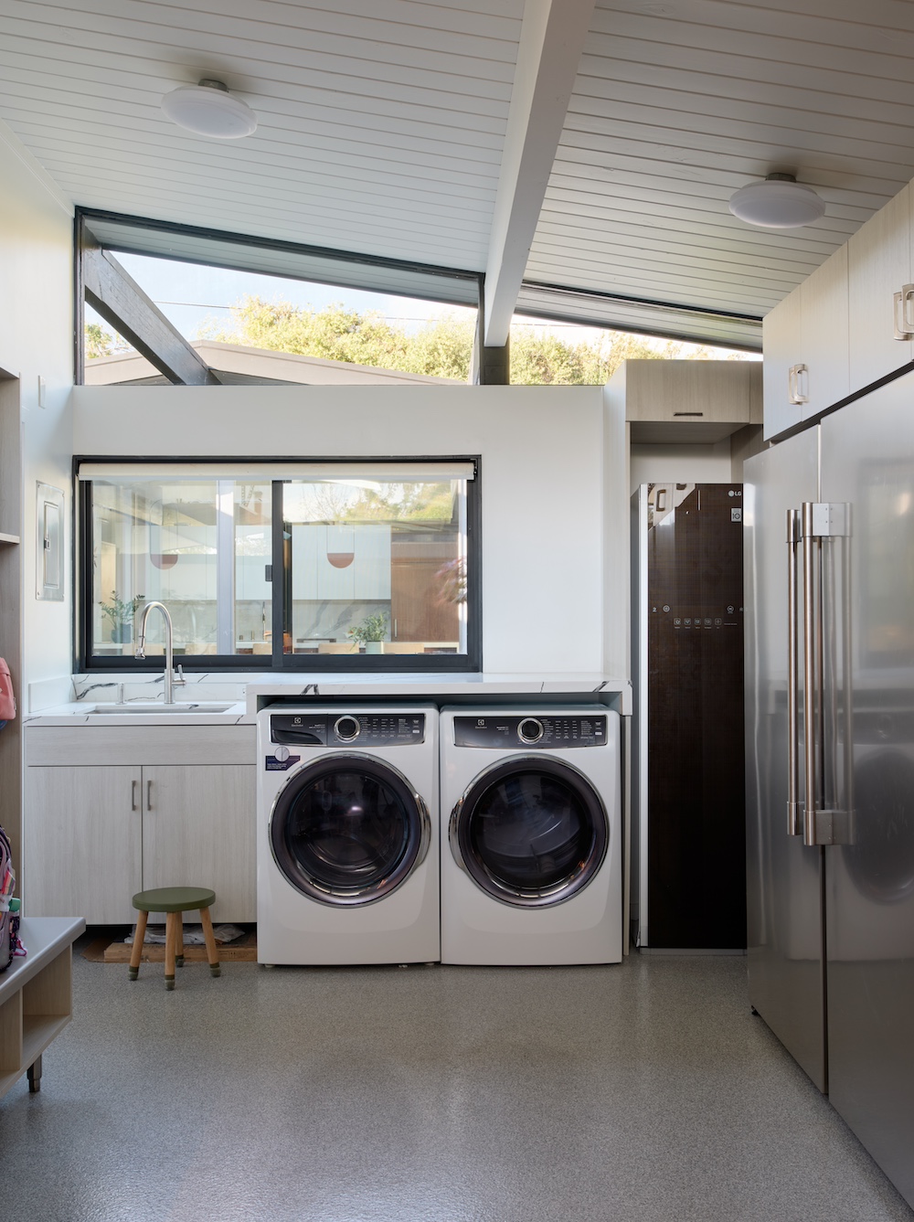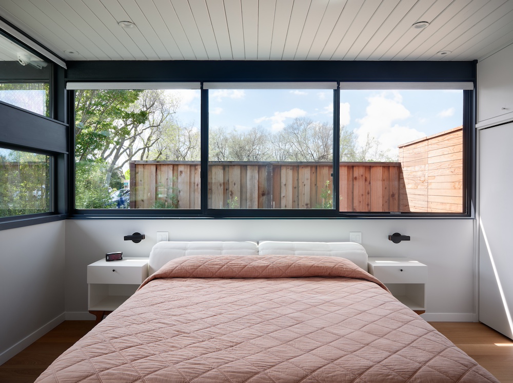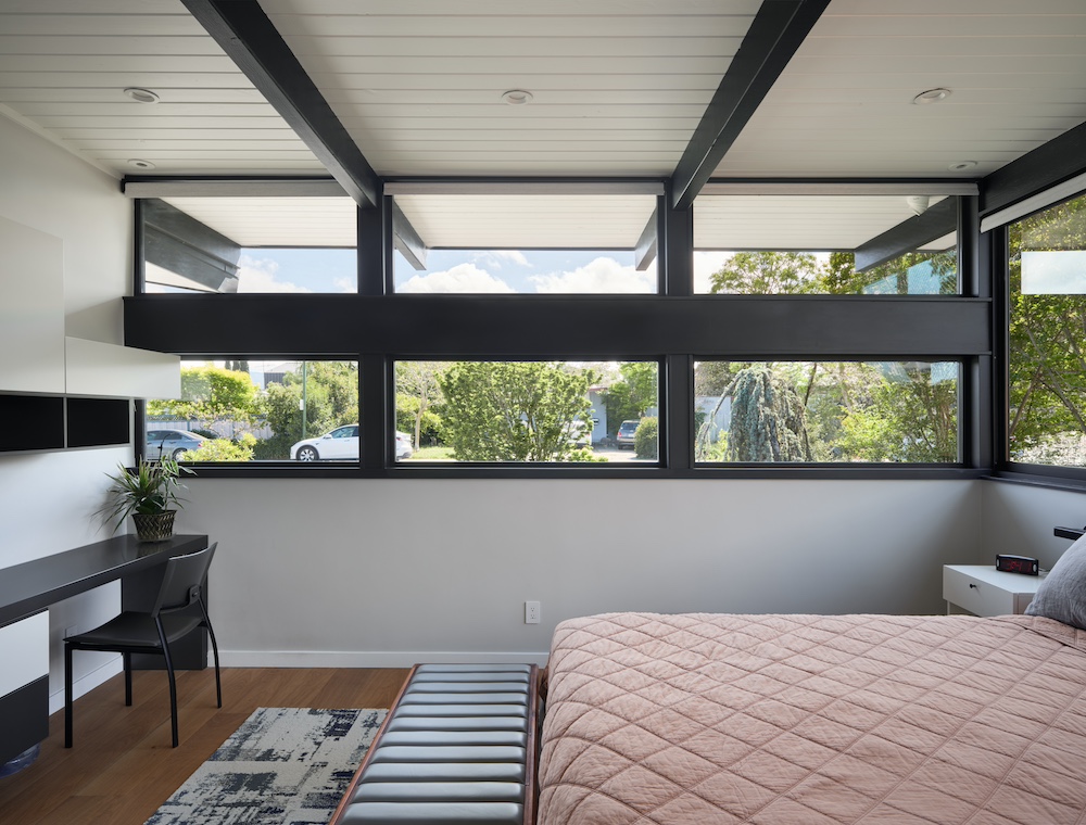 One of the major transformations took place in the bedroom wing, which was completely reconfigured to maximize space and flexibility. A new front addition was introduced, creating a guest suite for the grandparents, expanding the home to five bedrooms and three baths. This addition was crucial for maintaining a close-knit family dynamic. Along with the expansion, taller 9-foot ceilings were incorporated in select areas, bringing a sense of openness—a lofty achievement for the traditionally lower-ceilinged Eichler design.