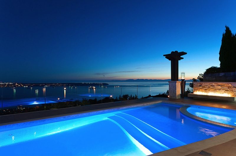 Actually, the entire home is decorated in a minimalist, but definitely not poor, contemporary style. The principal rooms on the lower and main level have direct access to heated terraces, offering an ideal indoor-outdoor communication. The exterior spaces are cozily furnished, and they even have 7 fireplaces and a gourmet summer kitchen. Speaking of outdoor entertainment, the property includes a resort-grade infinity pool, beautiful lighting system, and a 110-inch pool side TV.