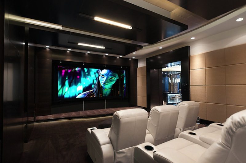 Below lies the entertainment area with amazing wet bar, temperature-controlled wine storage, and a soundproofed home theater with Titan Referance 3D projector, 160 inch Firehawk Stewart Sinecurve 110 inch screen, and a top-notch sound system. Another very impressive area of the house is the state-of-the-art kitchen with 4 ovens, professional grade appliances, 12-foot white stone island, and a very contemporary design.