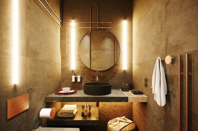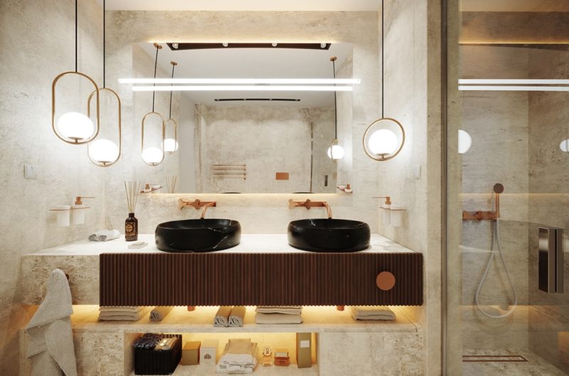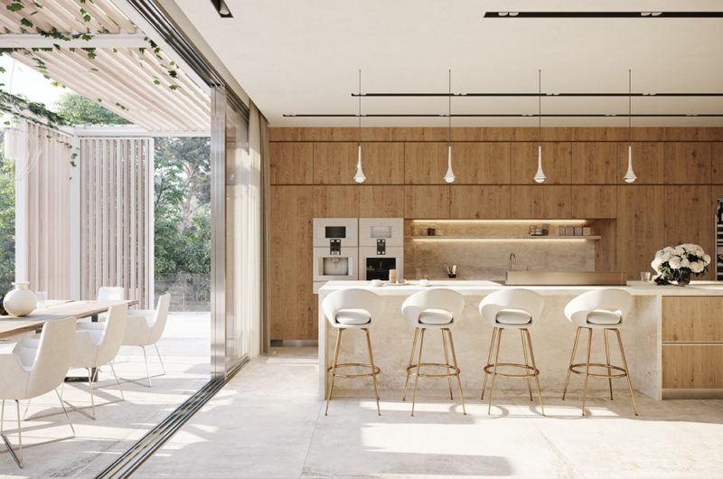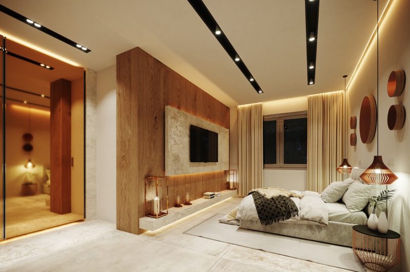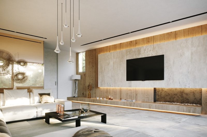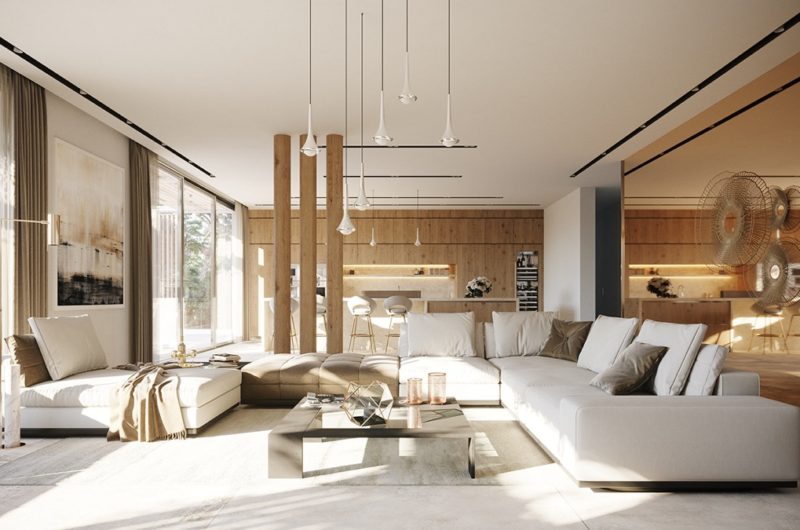 Moving inside the luxury villa, there is a large living room that has a U-shaped modular sofa arrangement. The cushions of the sofa are mixed taupe and white. It simply creates depth and light in this luxury living room. The wall is beautifully decorated with natural wood as well as white stones. There is a fireplace as well as LED lighting that really adds more to the beauty of a living room. Four kitchen pendant lights are also there that provide a welcoming ambiance during dinner or evening hours. Moreover, there is the main dining area in this luxury villa. Coming towards the kitchen, there are two rows of wooden cabinets and a modern Belfast style sink. In addition to that, there is a luxury bedroom and a bathroom as well.