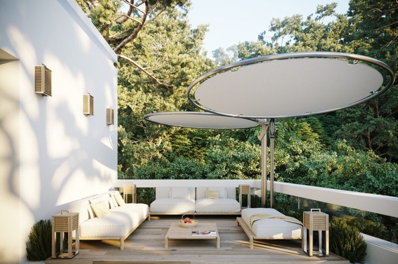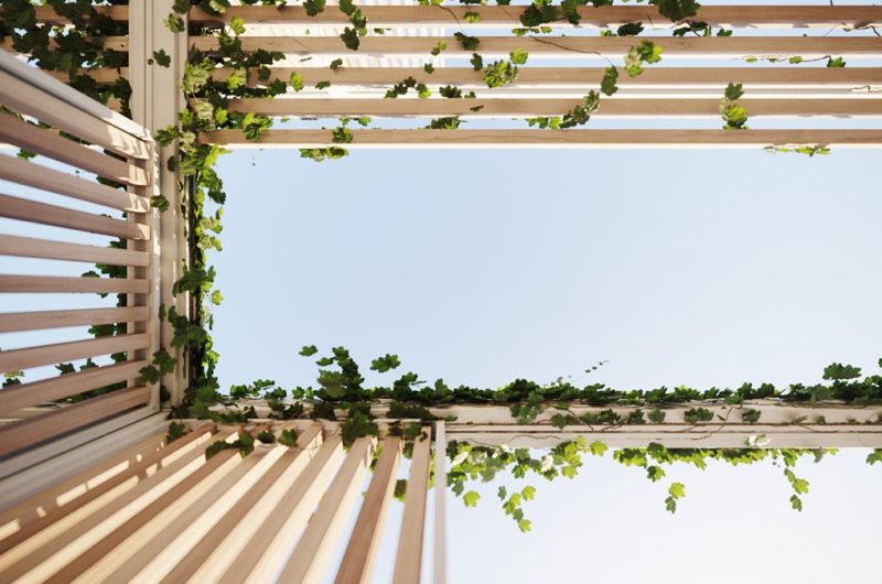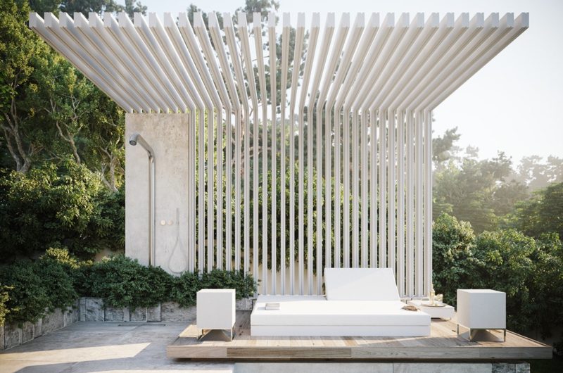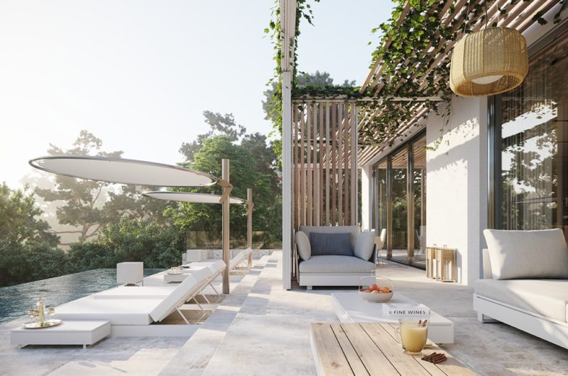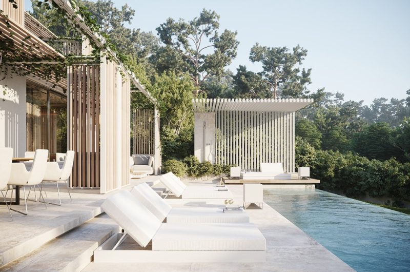 In front of an al fresco dining set, there is a luxury swimming pool in which sun loungers can enjoy swimming. Moreover, there is a separate sun deck at the head of the pool. An outdoor shower is also there. The edges of this luxury swimming pool are all covered with matured green shrubs. In addition to the luxury swimming pool, there are also individual sun shades that can create a cool effect over the rest of the sun loungers. Natural wood and charming ivy are used in the design that surrounds the outdoor lounge. An al fresco dining set and a luxury swimming pool add more to the beautiful exterior of this luxury villa.