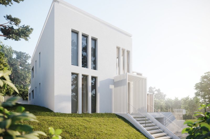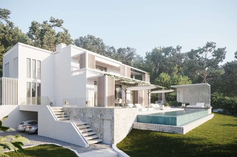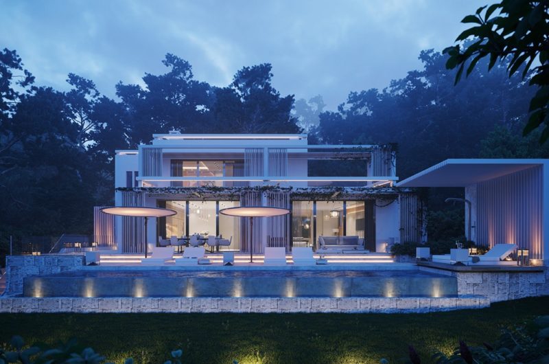 This luxury villa has a stunning and modern home exterior that cuts into the side of a lush green hill. There are a lot of mature trees that surround the exterior. There is a large patio area that divides the home from the lawn. It lets people enjoy the sparkling blue infinity swimming pool, al fresco eating area as well as an outdoor lounge. This dream luxury house includes the climbing plants that add to the greenery of the house. This luxury villa also contains the towering windows and a staircase at an exterior that joins the green grassy hills with the entrance of the villa.