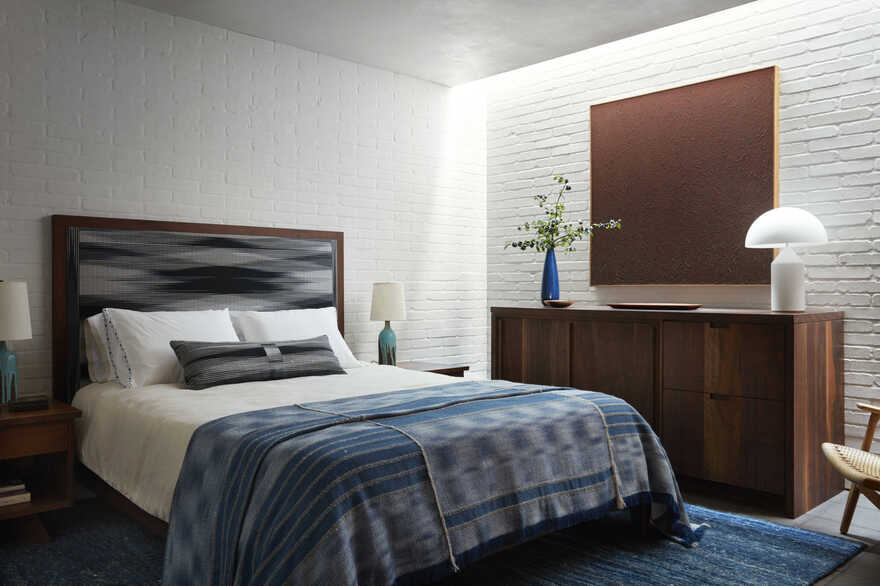 The entire living space has a rustic but a modern look. The architects have smartly divided the spaces using wood partition cum storage units. This California walnut casework appears to float around the rooms and makes it look light. Even though the use of bricks and wood could end up looking too masculine, this house denies the fact and acts as a humble retreat. Also, the wooden work throughout the apartment is made with recycled wood from local projects.