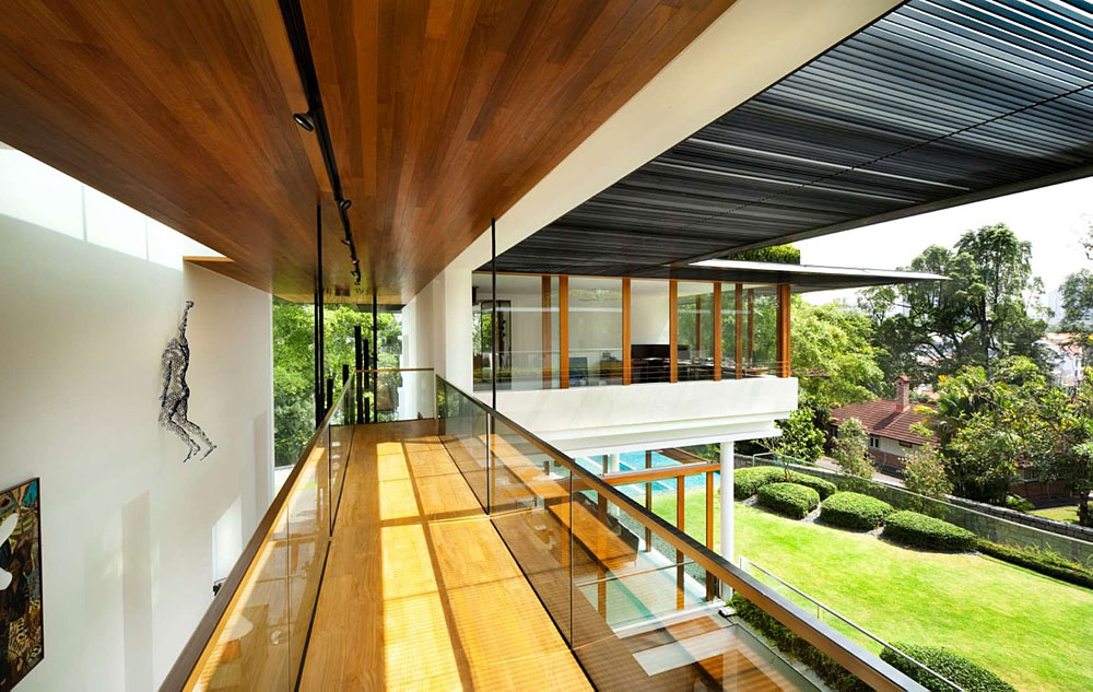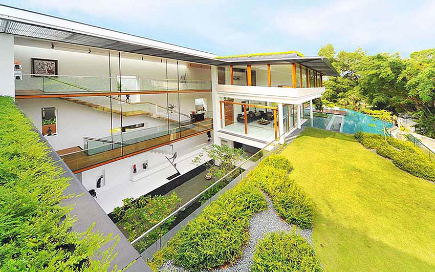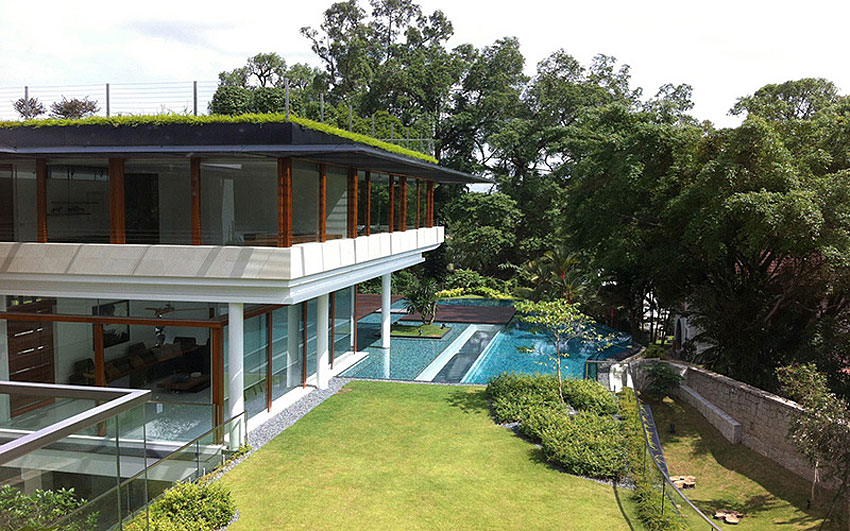 Dalvey Road House is a modern tropical bungalow located in Singapore that was completed in 2012 by Guz Architects.