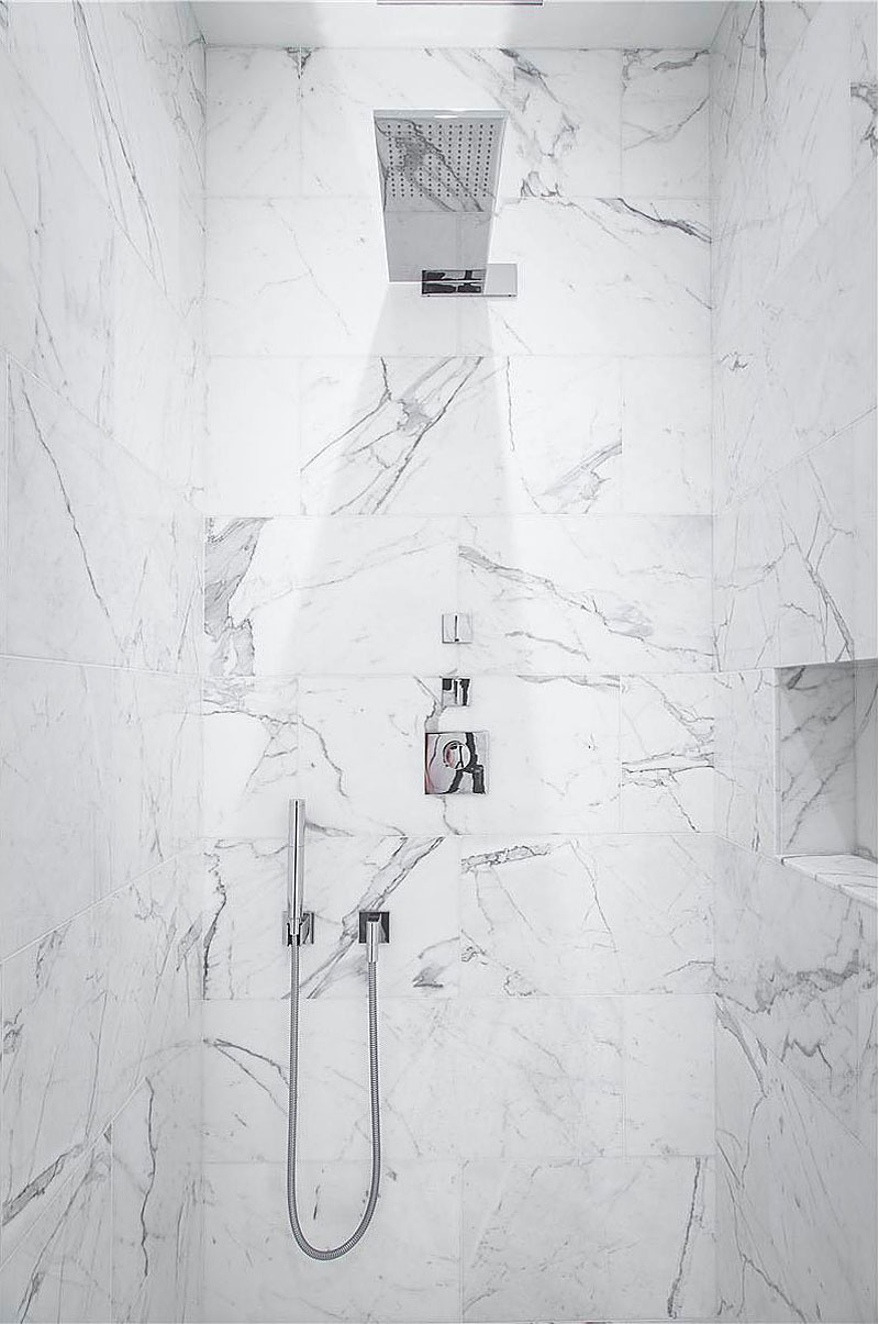 The impressive master bedroom has its own arched window and 20′ of floor to ceiling custom twin closets. The dramatic en-suite master bathroom has a large soaking tub with a spectacular backdrop of Italian statuary marble. Additionally, it is equipped with radiant heated flooring, separate dual vanities, and a spacious shower. Fixtures are Dornbracht and Fantini throughout.