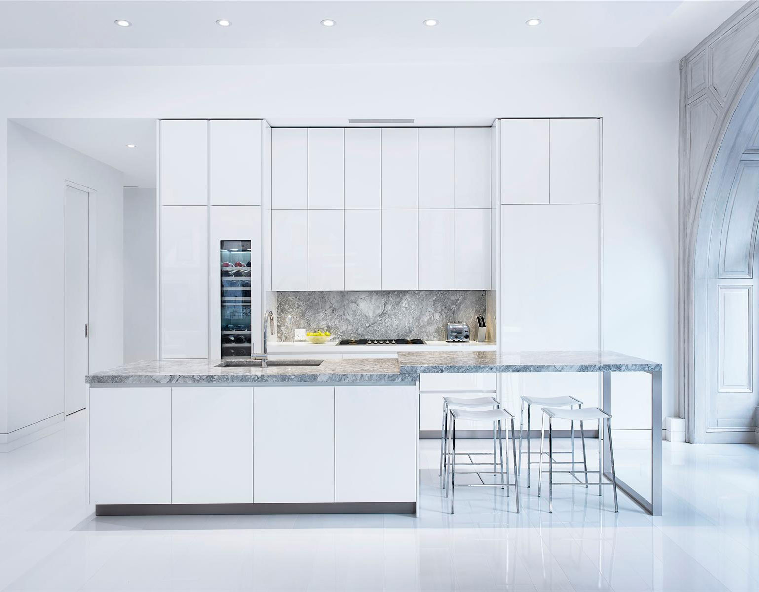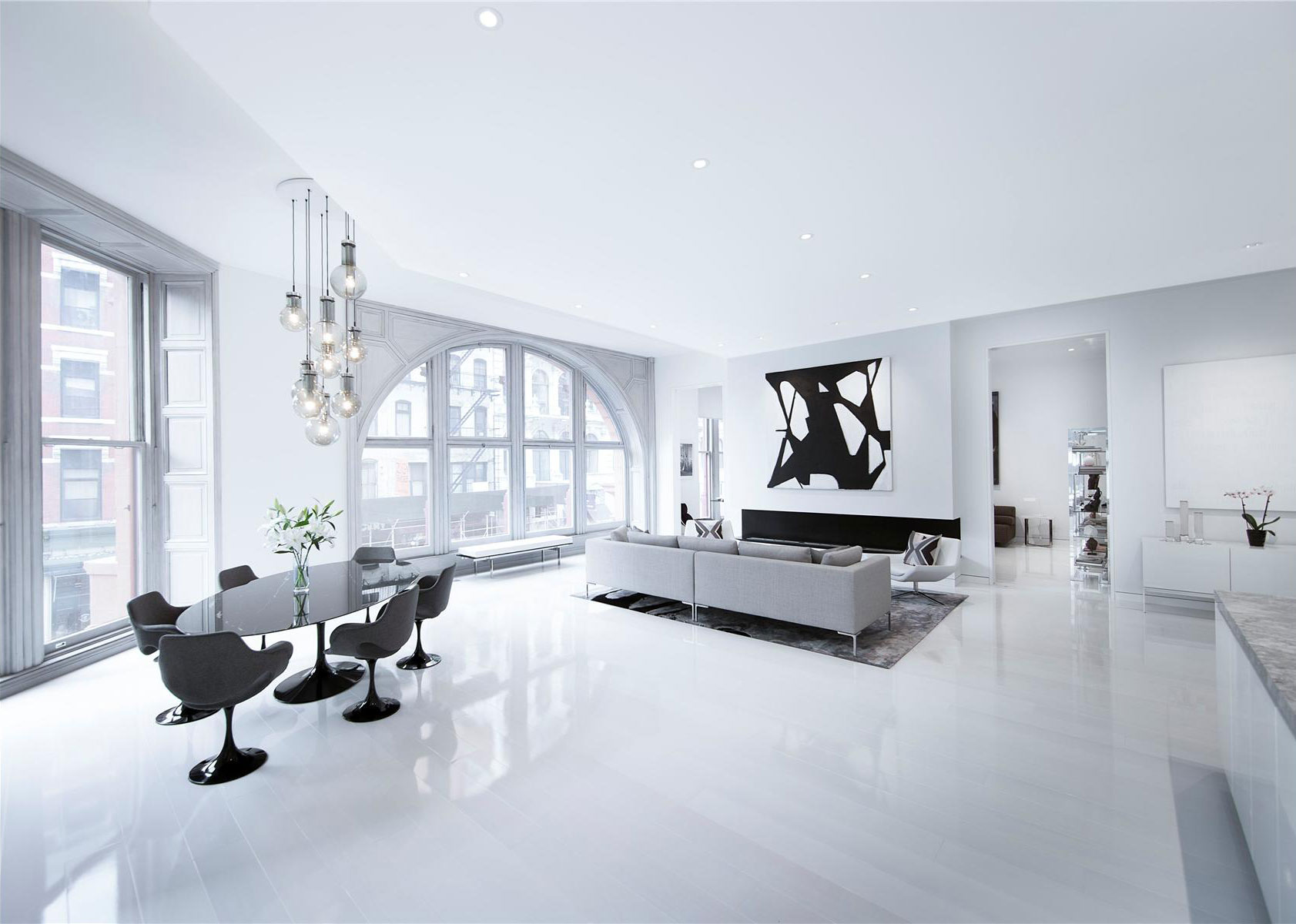 Located within the historic MSI building in Noho, New York, USA, this superb corner loft received an extensive renovation that allowed it to meet contemporary standards of fine living without sacrificing its historical heritage. Arched floor-to-ceiling windows can now be observed within the main living space, which leads the way to an inviting 48′ great room and a kitchen that flaunts a 12′ marble island and a separate dining space.