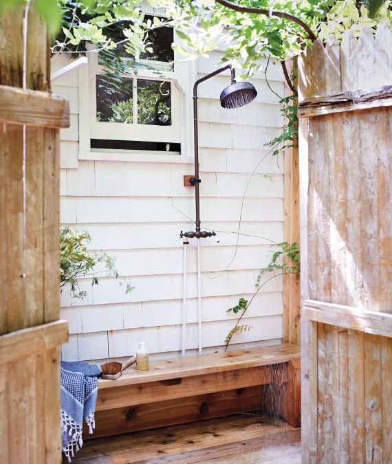 - Use wood where possible so that the shower blends in with its natural surroundings.