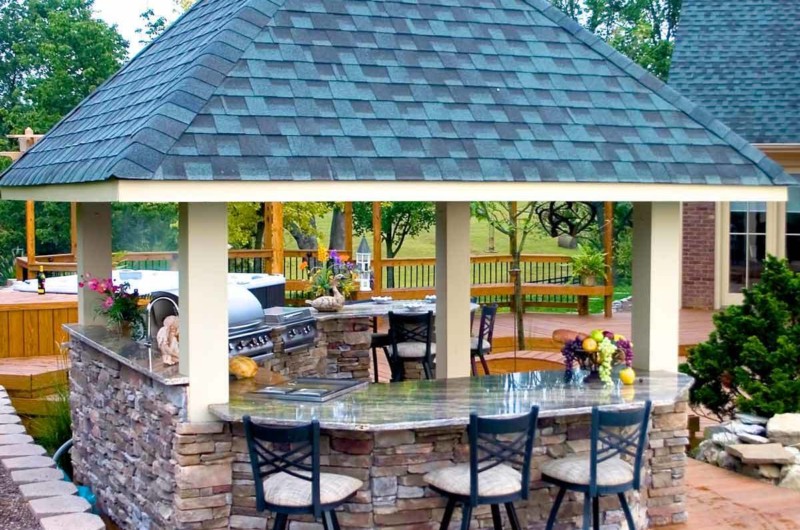 When you are designing a kitchen for your outdoor space do not forget to keep a natural feel. Choosing wooden cabinets and stone worktops can help you to do this.